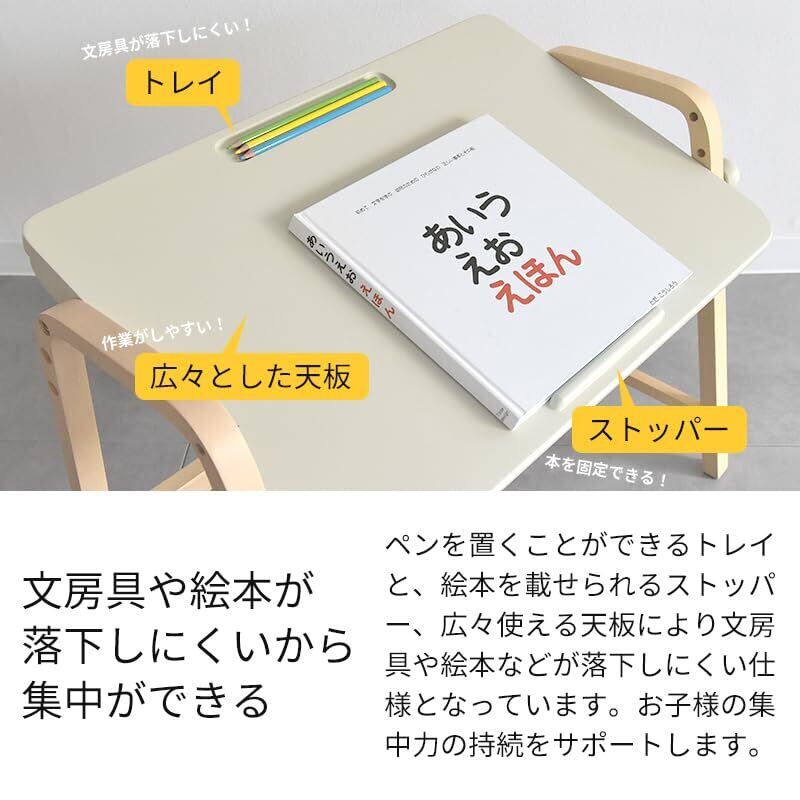 落下防止ストッパーとトレイ付き → 文房具や絵本の落下を防止し、集中力維持をサポート