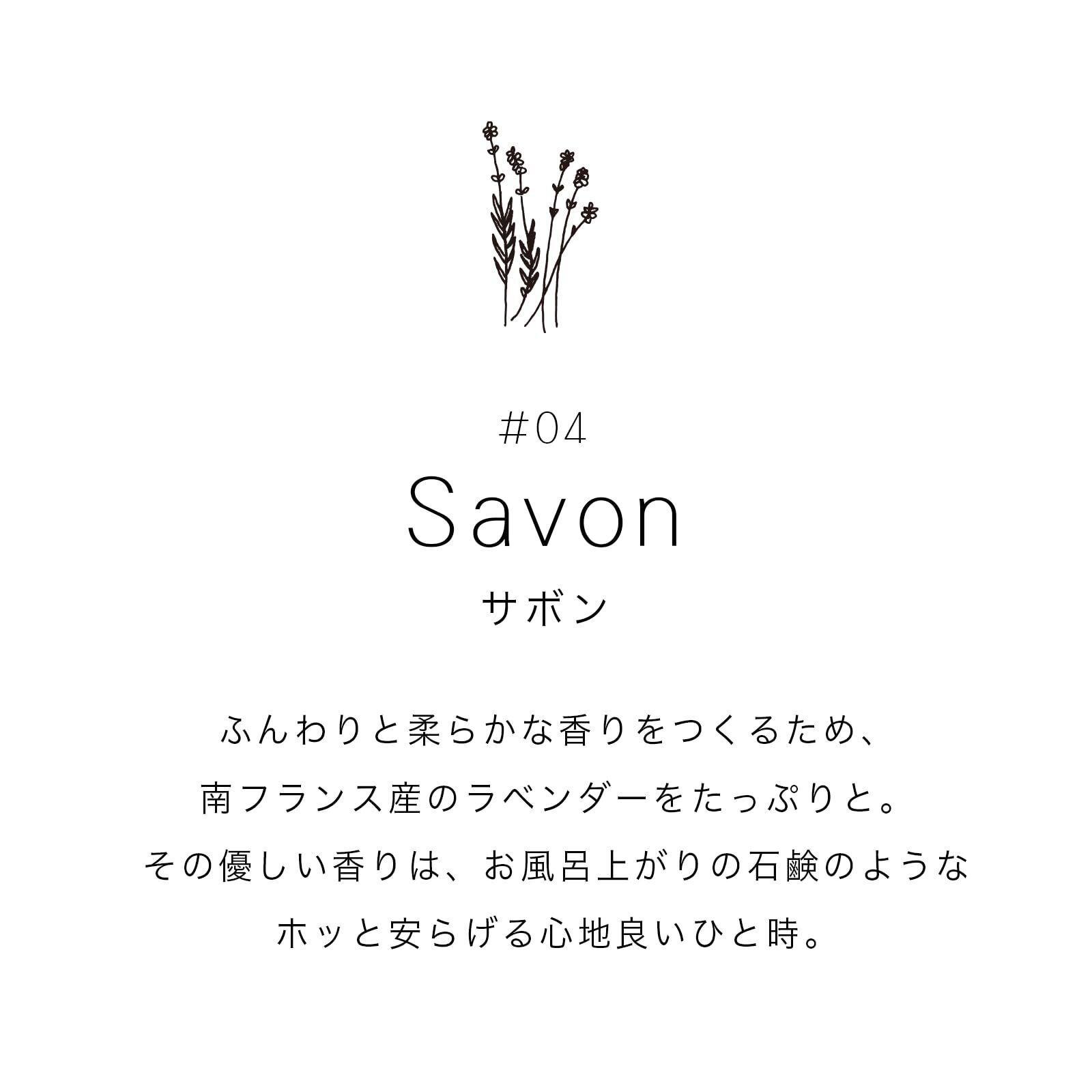 【#04 Savon サボン】 ふんわりと柔らかな香りをつくるため、南フランス産のラベンダーをたっぷりと。その優しい香りは、お風呂上がりの石鹸のようなホッと安らげる心地良いひと時。