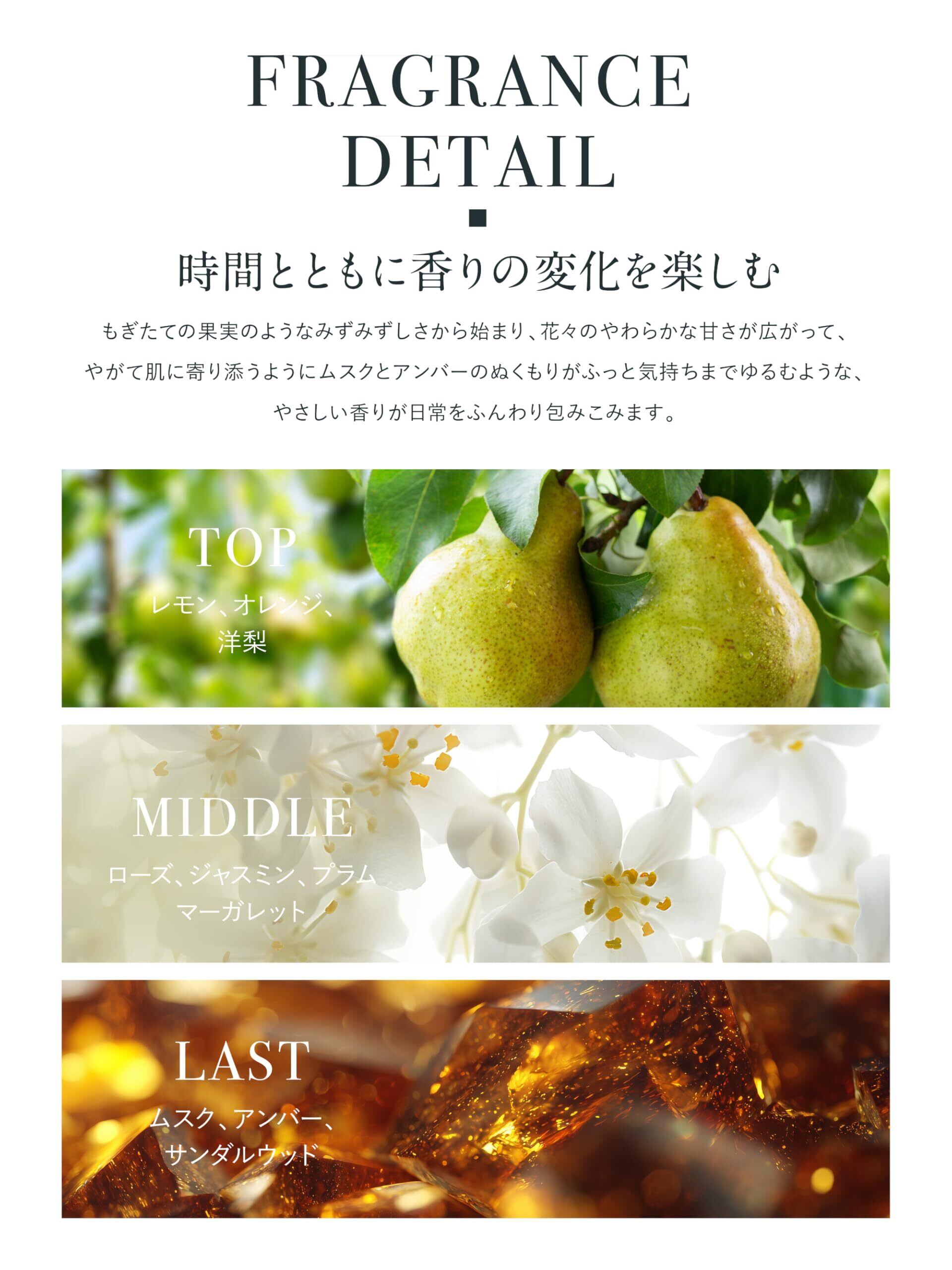 ✨【香りのディテール】TOP:レモン、オレンジ、ペア(洋梨)。MIDDLE:ローズ、ジャスミン、プラム、マーガレット。LAST:ムスク、アンバー、サンダルウッ