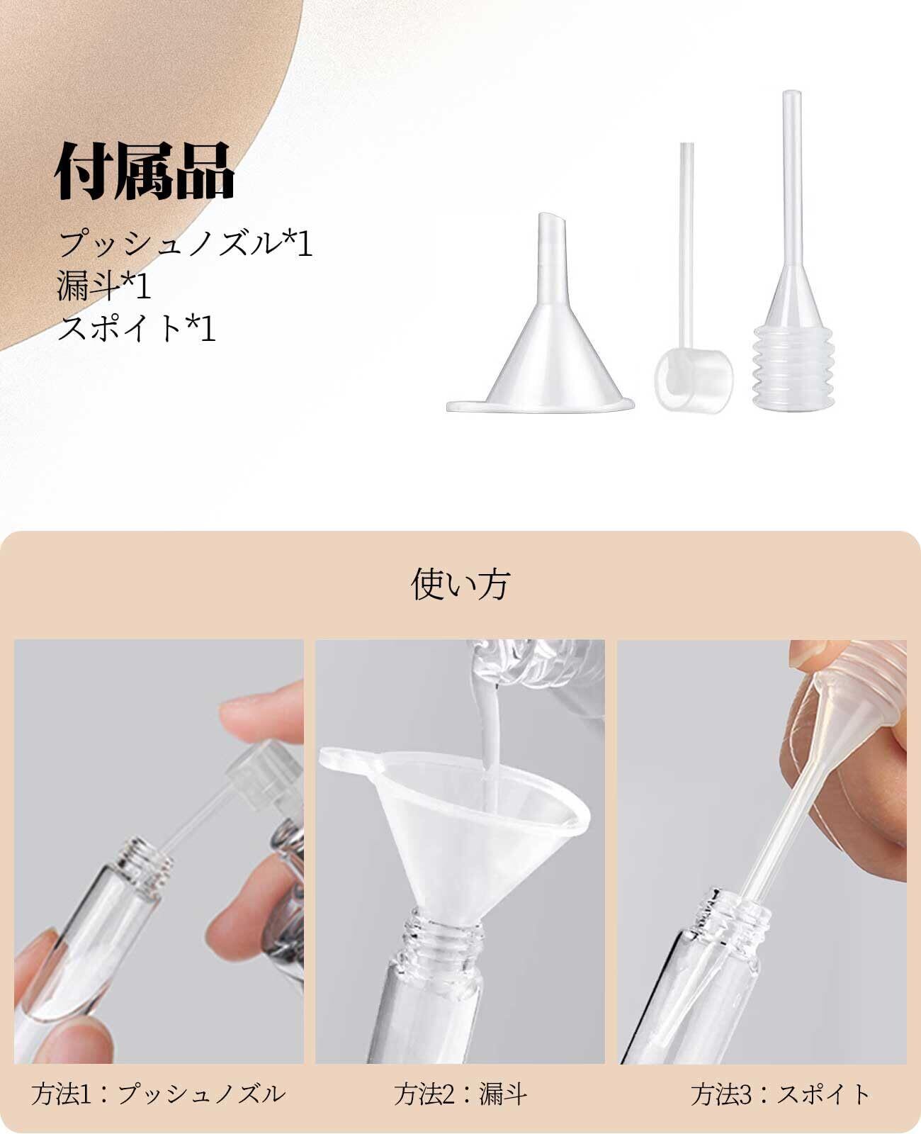 【ツール付属·漏れなく無駄遣いない完璧なセット】香水のブランドやノズルのタイプを問わず、ほぼ市販しているすべての香水にも対応できます。プッシュノズル、漏斗、スポイト三つ種類の香水分けツールを付属していて、お好みのツールを使って香水を簡単に詰め替えます。詰め替えの過程の中も香水を漏れることを完璧に避けます。