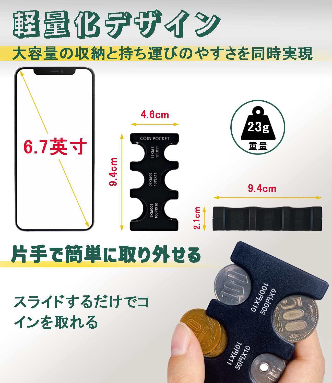 【ワンタッチ操作】サイズ:約9.5cm×4.7cm×2cm、重さ:23g、ABS樹脂で製作、優れた滑り止め機能と耐久性を備えています。使いこなせば片手でケースをしっかり握ってから、取り出したい硬貨の上に指を置いて、軽く押し出すだけでスムーズに取り出せることで、支払い時間を大幅短縮!