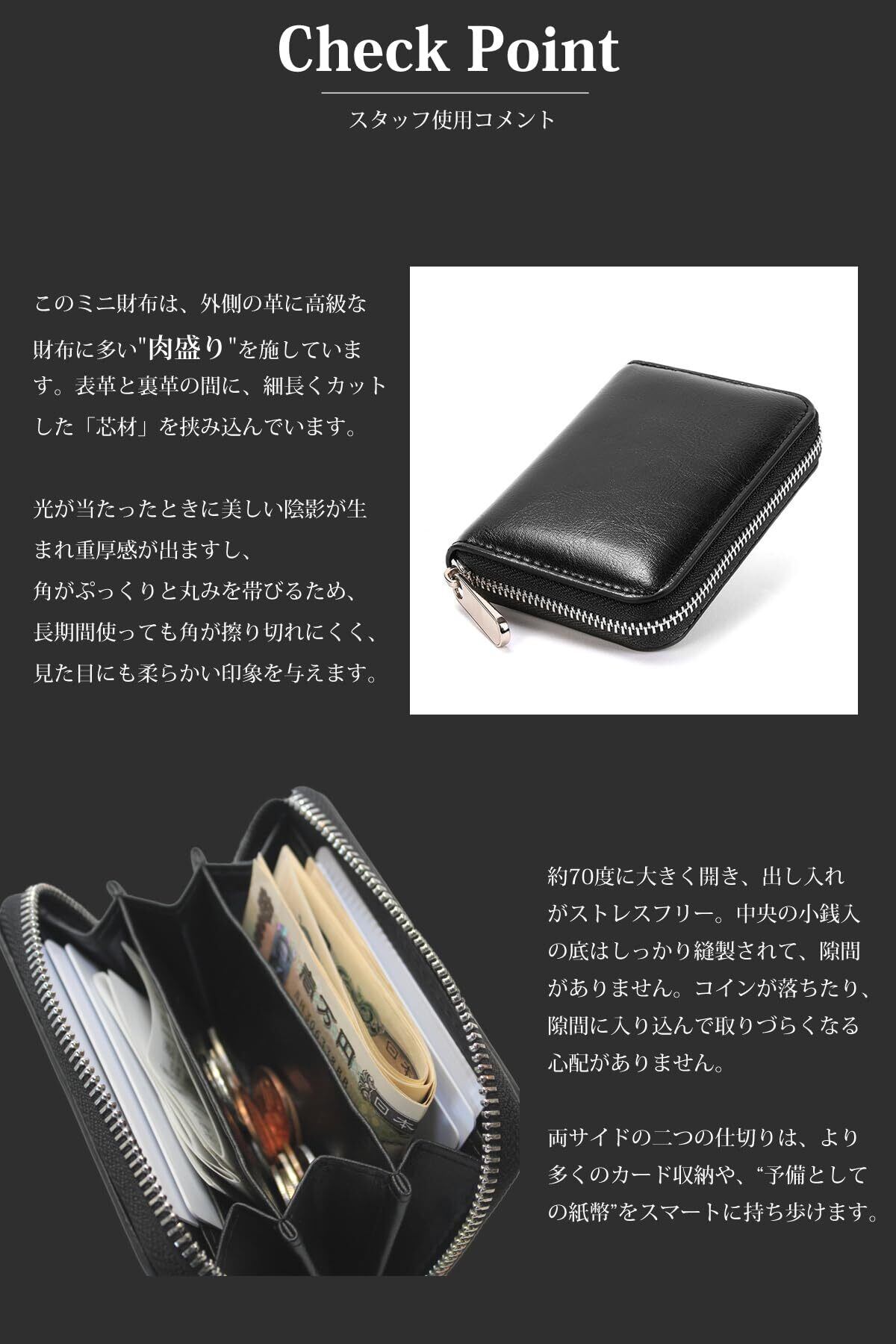 【 こだわり構造 】 小銭入れの内側に3つの仕切り。中央スペースは底に隙間がなく、小銭が散らばることがありません。その他2個のスペースは、札入れ(二つ折り)、レシート入れ、カード入れ等でご利用できます。 【 肉盛り 】 外側の革に"肉盛り"を施しています。表革と裏革の間に、「芯材」を挟み込んでいます。美しい陰影が生まれ重厚感が出ます。 【 シークレットポケット 】カードポケットの1段目はカードをスッポリ収納できるシークレットタイプです。