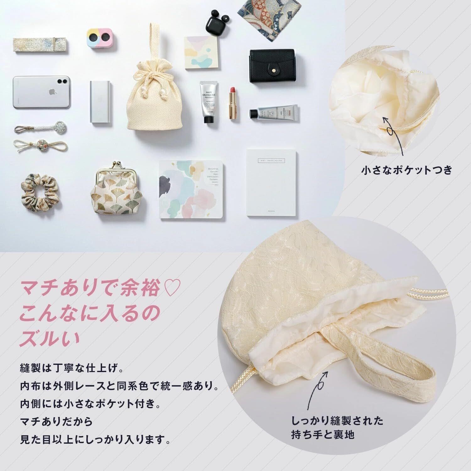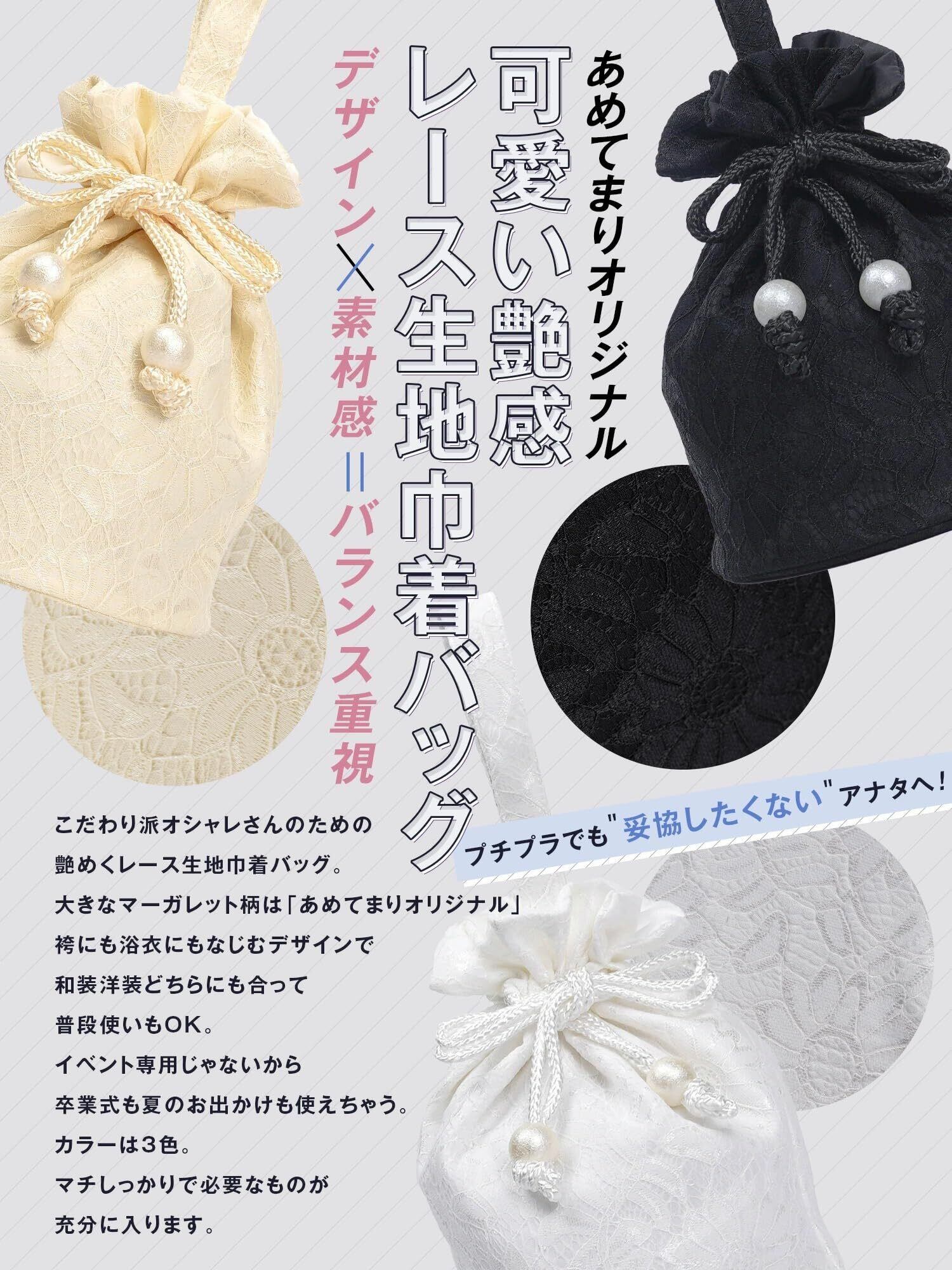 \ 袴にも浴衣にもなじむデザイン /艶めく本格レース生地「あめてまりオリジナルマーガレット柄 レース生地 巾着バッグ」です。