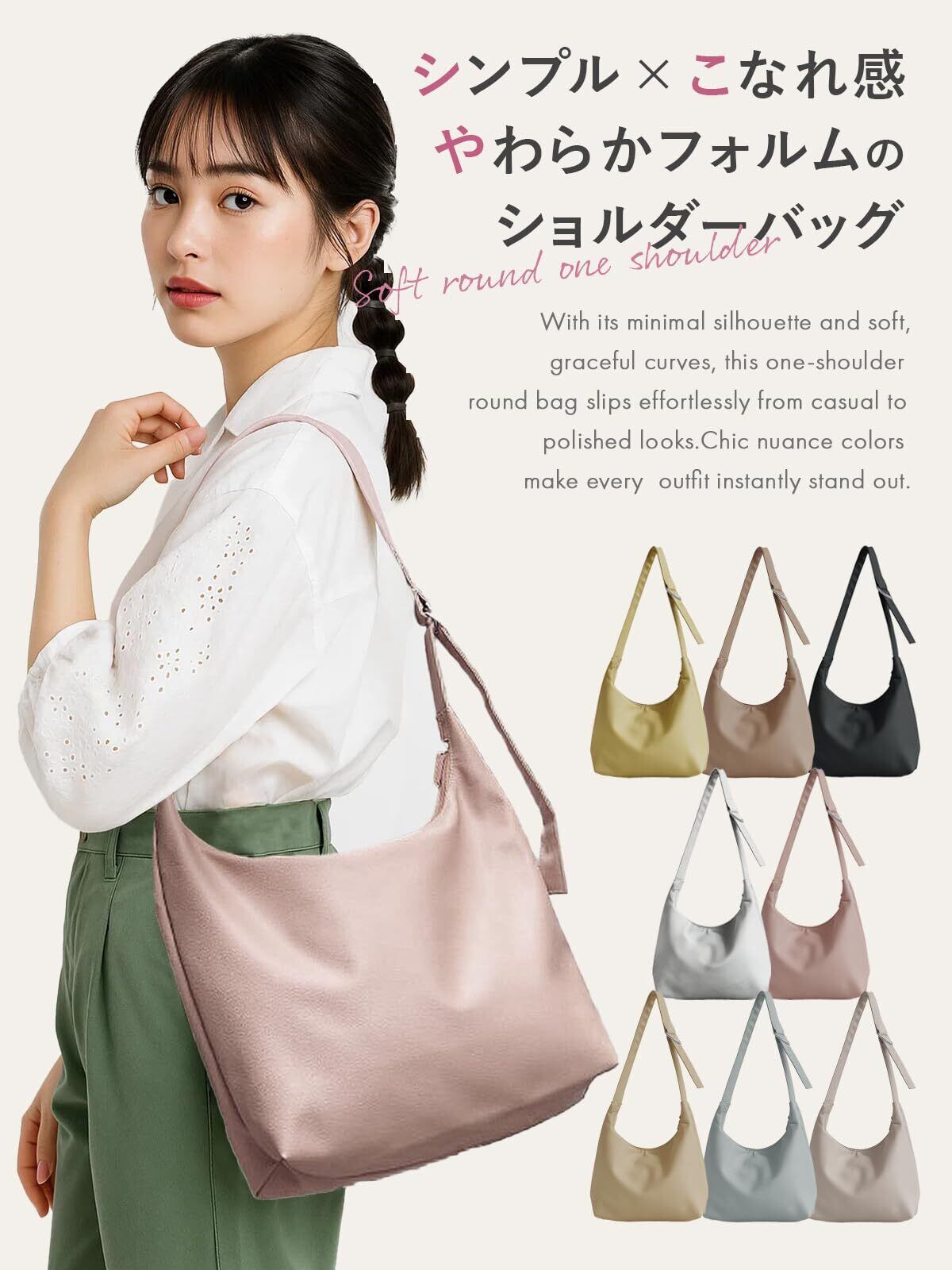【シンプル&高見え|普段使い・通勤&通学~お出掛けまで】 ミニマルな外観と、やわらかな曲線が美しいワンショルダーラウンドバッグ。カジュアルからきれいめまで幅広いコーデにマッチし、映えるニュアンスカラーが毎日のスタイルを格上げします。