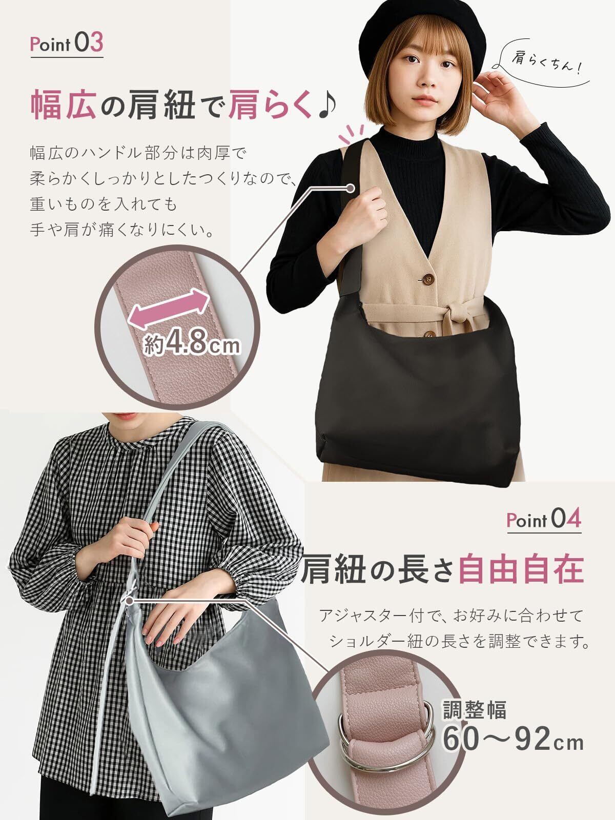 【幅広ハンドル&クッション入り|肩にやさしい】 ふわふわの幅広ショルダーベルトで、肩への負担を軽減。長時間の持ち運びでも肩が痛くなりにくく、ワンショルダーでも快適に使えます。