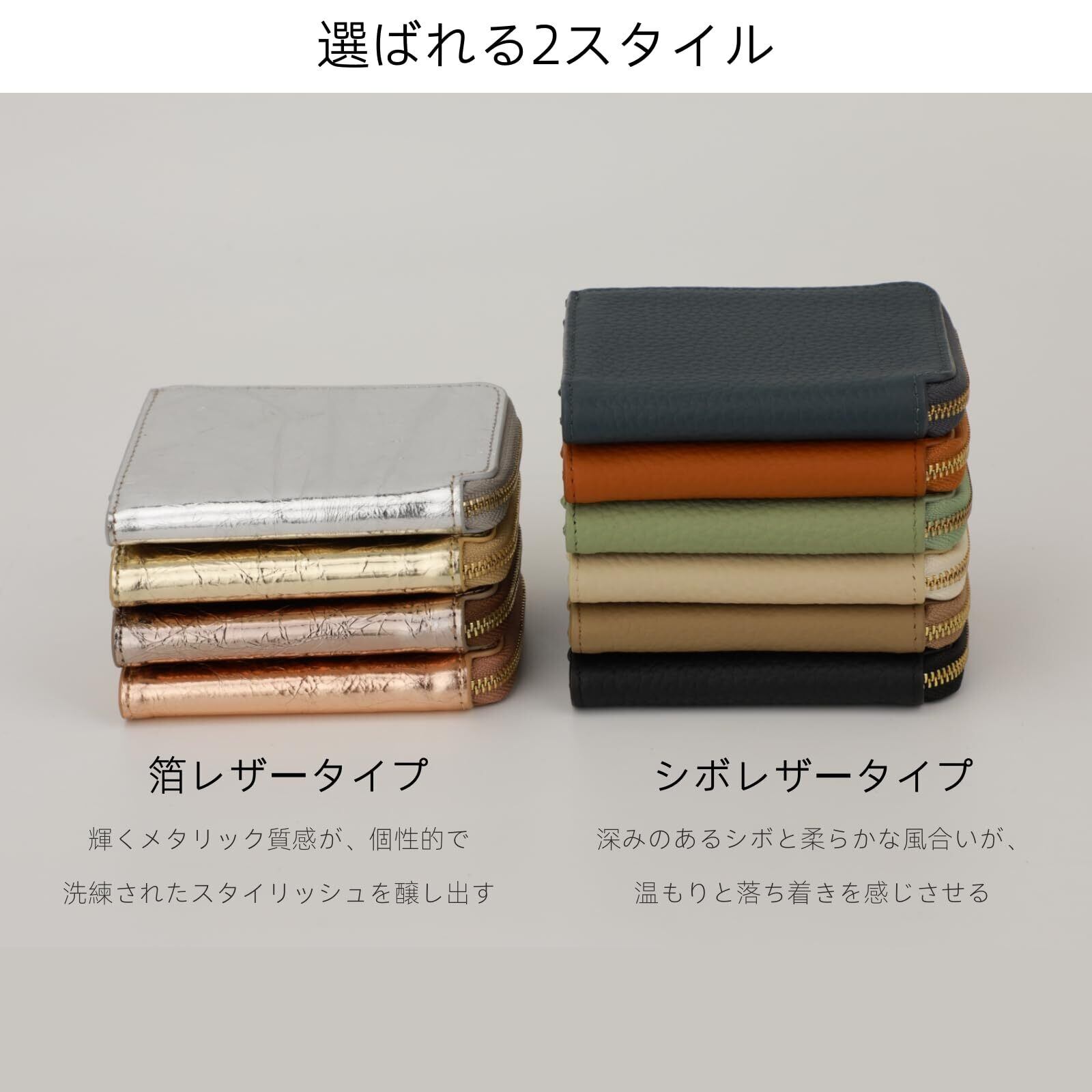 【全10色の豊富なカラーバリエーション】 様々なシーンやお好みのスタイルに合わせて選べる、全部で10色をご用意。プレゼントにも最適です。母の日、バレンタイン、ホワイトデー、クリスマス、誕生日など、記念日の贈り物としてもご利用ください。 【箔レザーモデル】 Rose Pink (ローズピンク) / Silver (シルバー) / Gold (ゴールド) / Rust (錆色) 【シボレザーモデル】 Black (ブラック) / Milky White (ミルキーホワイト) / Brown (ブラウン) / Navy (ネイビー) / Light Green (ライトグリーン)