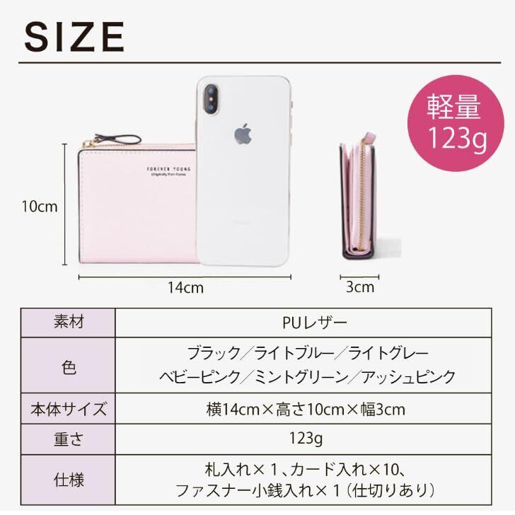 【仕様・カラー展開】サイズ 縦14cm×横10cm×厚み3cm お札入れ×1、ラウンドファスナー小銭入れ(仕切りあり、さらに内部にファスナー付きポケット)×1、カード入れ×10 カラー展開:ブラック、ライトブルー、ライトグレー、ベビーピンク、ミントグリーン、アッシュピンク 専用化粧箱付き