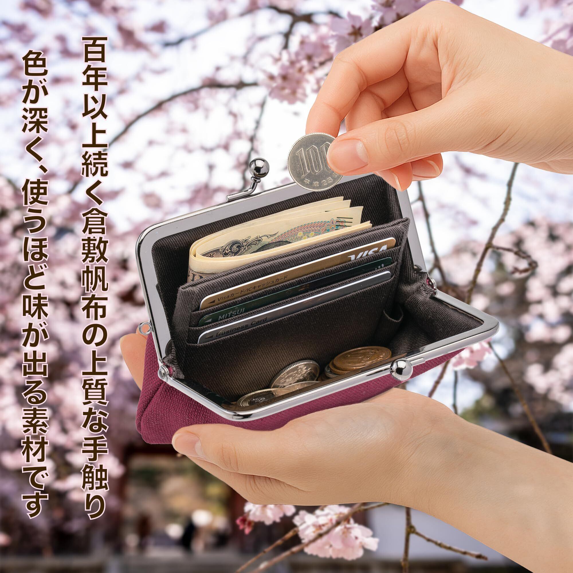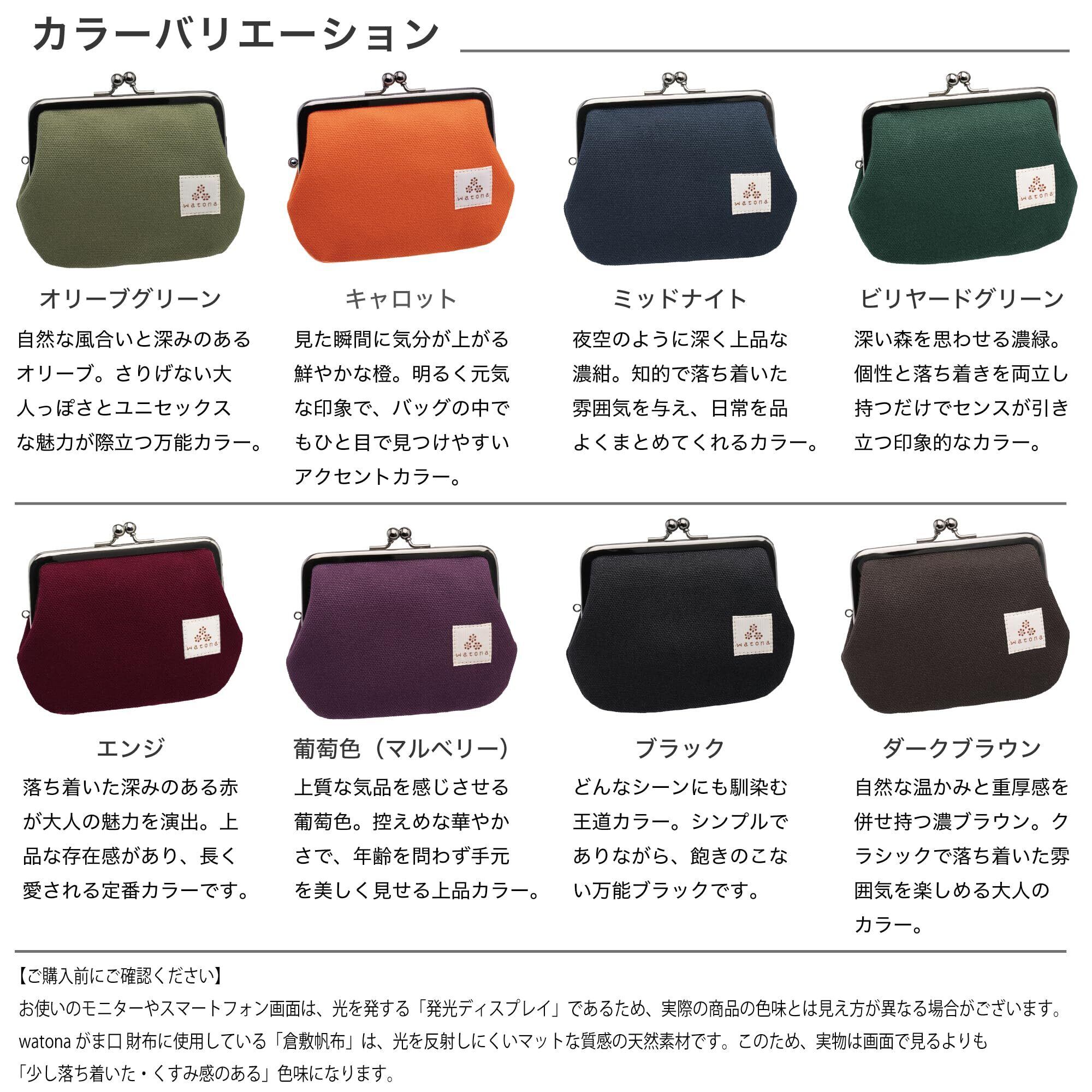 【素材】表地:倉敷帆布(8号・綿100%)/裏地:カツラギ生地(綿100%)/口金:鉄製・ブラッククロームメッキ。【サイズ】横幅約13.5cm・高さ約11cm・厚み約2cm・重量約70g。【収納】可動式仕切り1つ、カードポケット3つ、カード数枚収納可、2つ折り札収納、小銭が見やすいワイド開口。【特徴】小銭が探しやすい構造でレジ前でも素早く支払い可能。仕切りが倒れて取り出しやすく、軽量コンパクトで普段使いに最適。落ち着いた帆布カラーで男女兼用、ギフトにも好評。【ブランド】watona(京都のがま口ブランド)。【使用シーン】日常・お出かけ・旅行・サブ財布に。