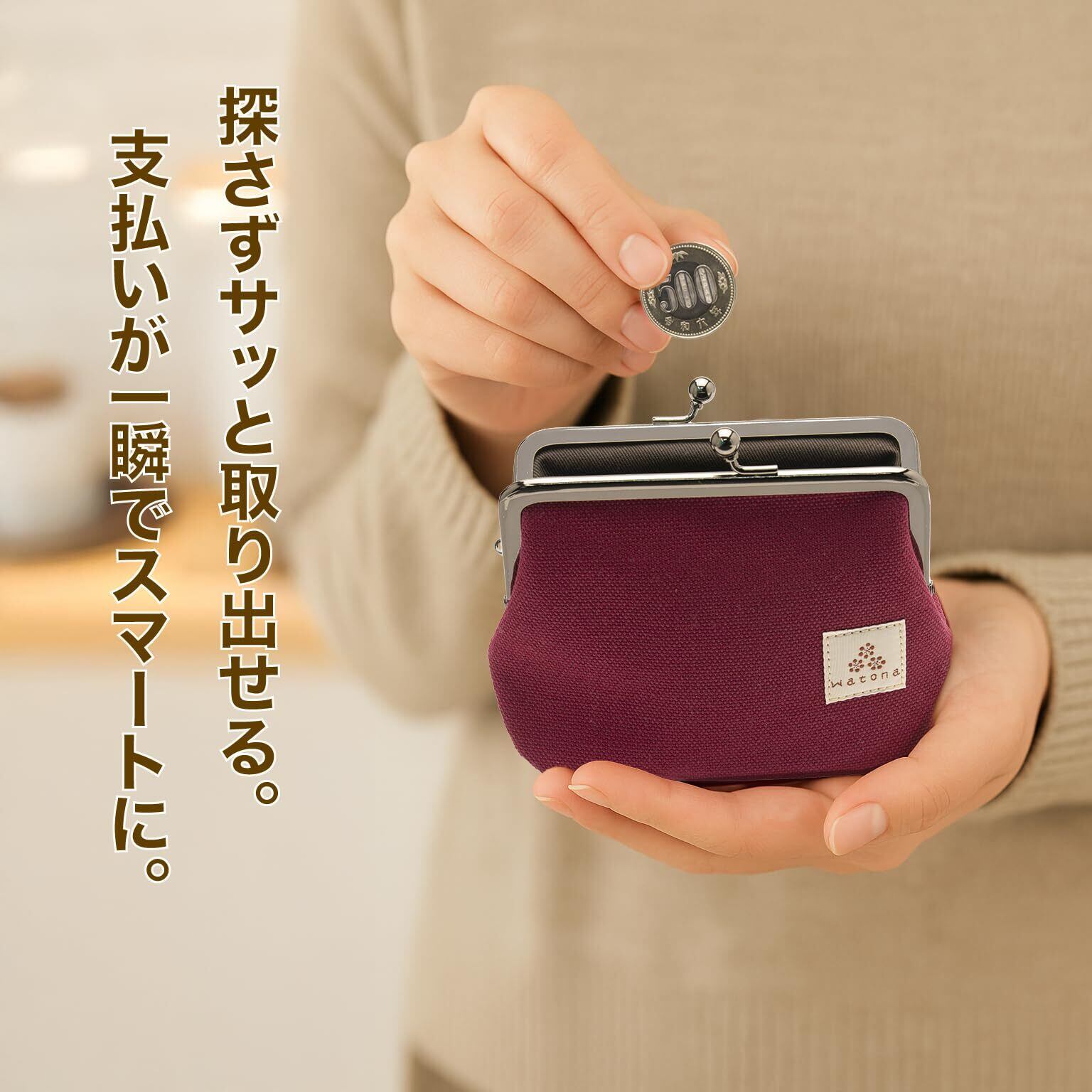 毎日の支払いが驚くほどスムーズになる、watonaの新作がま口財布。 最大の魅力は、小銭が一目で見える「可動式仕切り」構造。 がま口を開けた瞬間、硬貨の位置がぱっと分かり、 探さずサッと取り出せる“ストレスゼロ”の使い心地を実現しました。 内部には可動式の仕切りに加え、カードポケット3ヶ所を装備。 折りたたんだお札も入り、コンパクトながら収納力は十分。 普段使い・お出かけ・旅行用のサブ財布としても大変便利です。 素材には、耐久性と風合いの良さで人気の倉敷帆布(8号・綿100%)を使用。 使うほどに味わいが増し、手になじむ柔らかさが魅力です。 裏地には丈夫なカツラギ生地(綿100%)を採用し、 内側までしっかりと仕上げています。 口金は高級感のあるブラッククロームメッキ。 職人が調整した開閉は、軽く開いて「パチン」と気持ちよく閉まる操作性。 70gの軽量設計で、バッグやポケットの中でもかさばりません。 落ち着いたカラーとシンプルなデザインで、年齢を問わず使いやすく、 プレゼントにも喜ばれる実用的なミニ財布です。