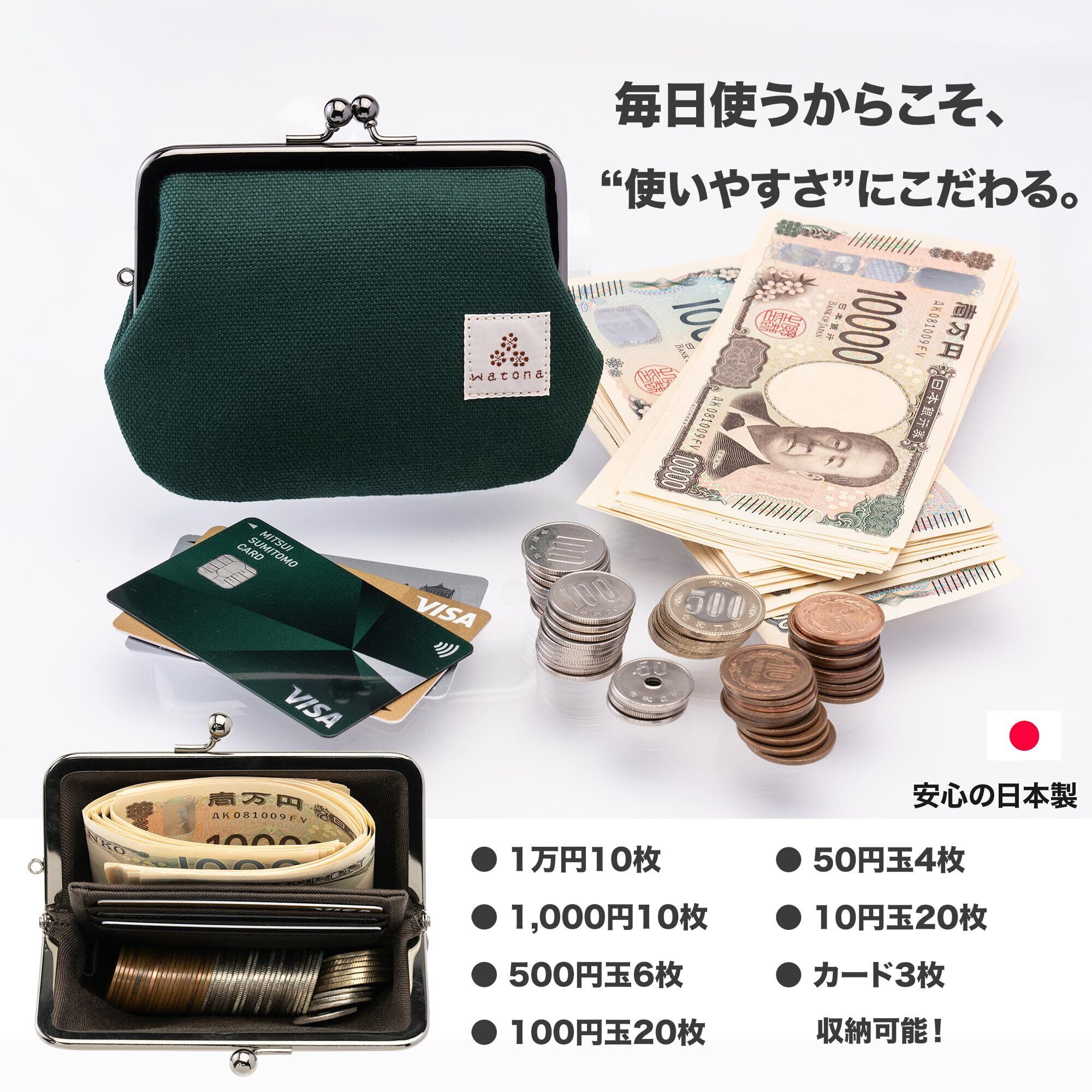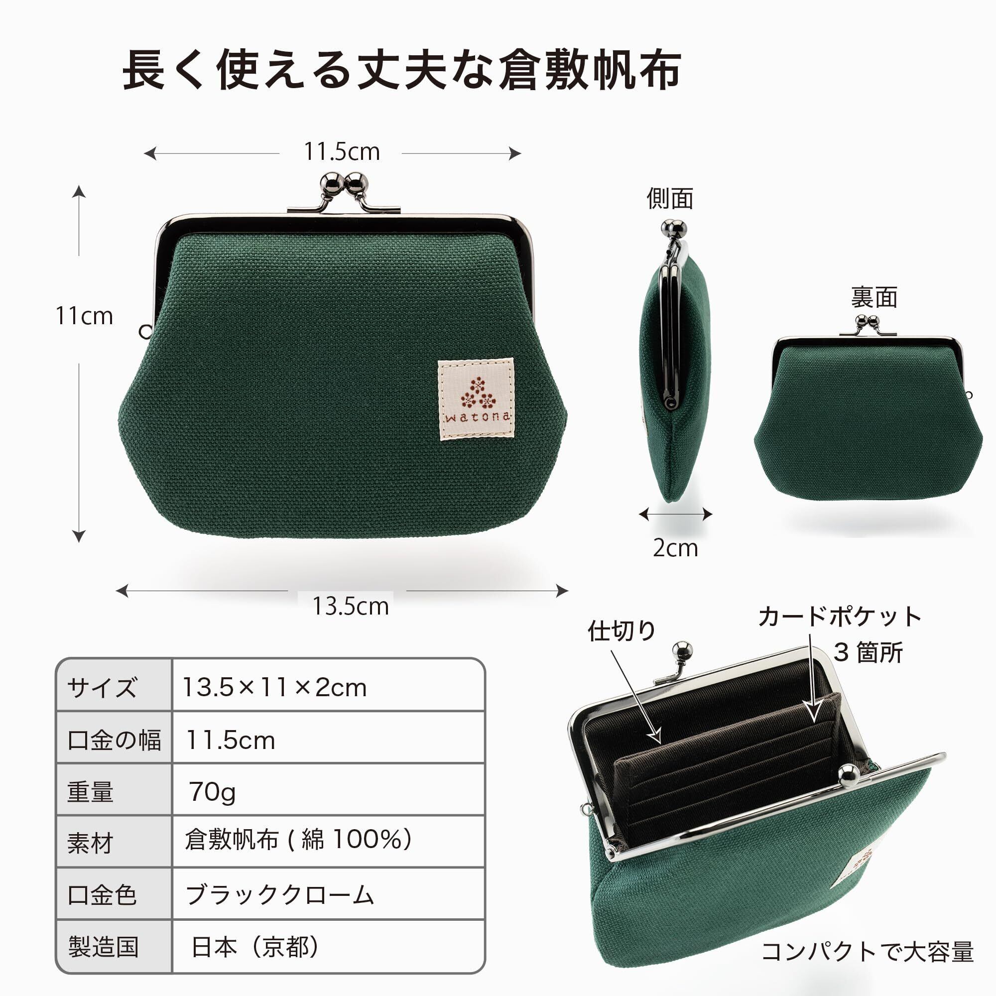 watona がま口財布 仕切り付き 小銭が見やすい 可動式ポケット 倉敷帆布 コインケース レディース 取り出しやすい ミニ財布 軽量 ギフト (ビリヤードグリーン)