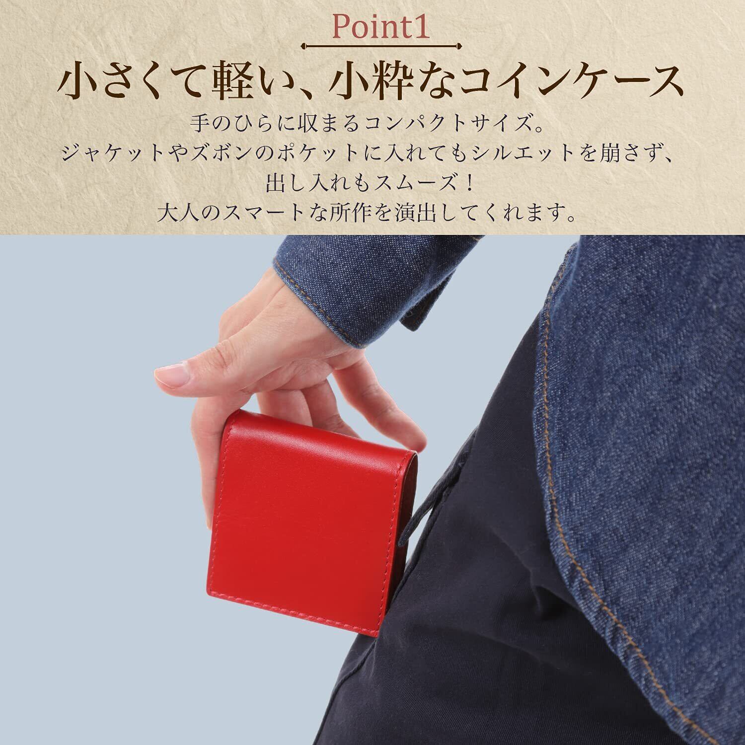 【小さくて軽い、小粋なコインケース】手のひらに収まるコンパクトサイズ。ジャケットやズボンのポケットに入れてもシルエットを崩さず、出し入れもスムーズ!大人のスマートな所作を演出してくれます。