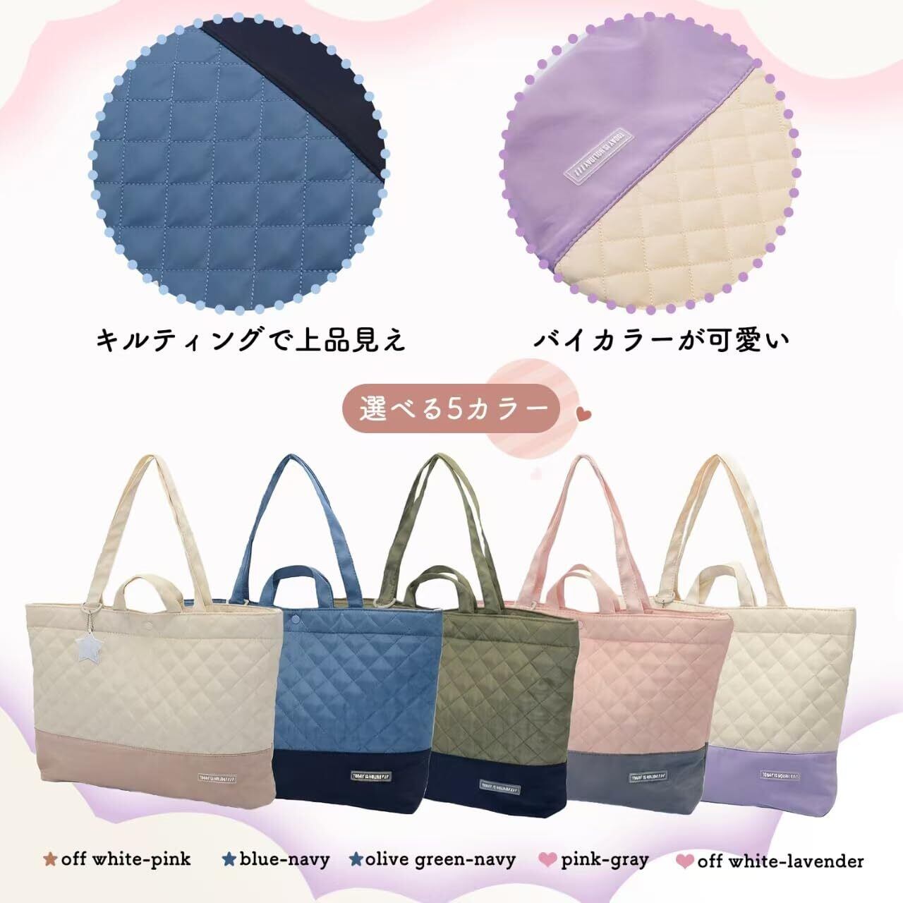 キルティングのやさしい風合いと、汚れが目立ちにくい底部切替のバイカラーデザインで、成長に合わせて長く使えるレッスンバッグです。