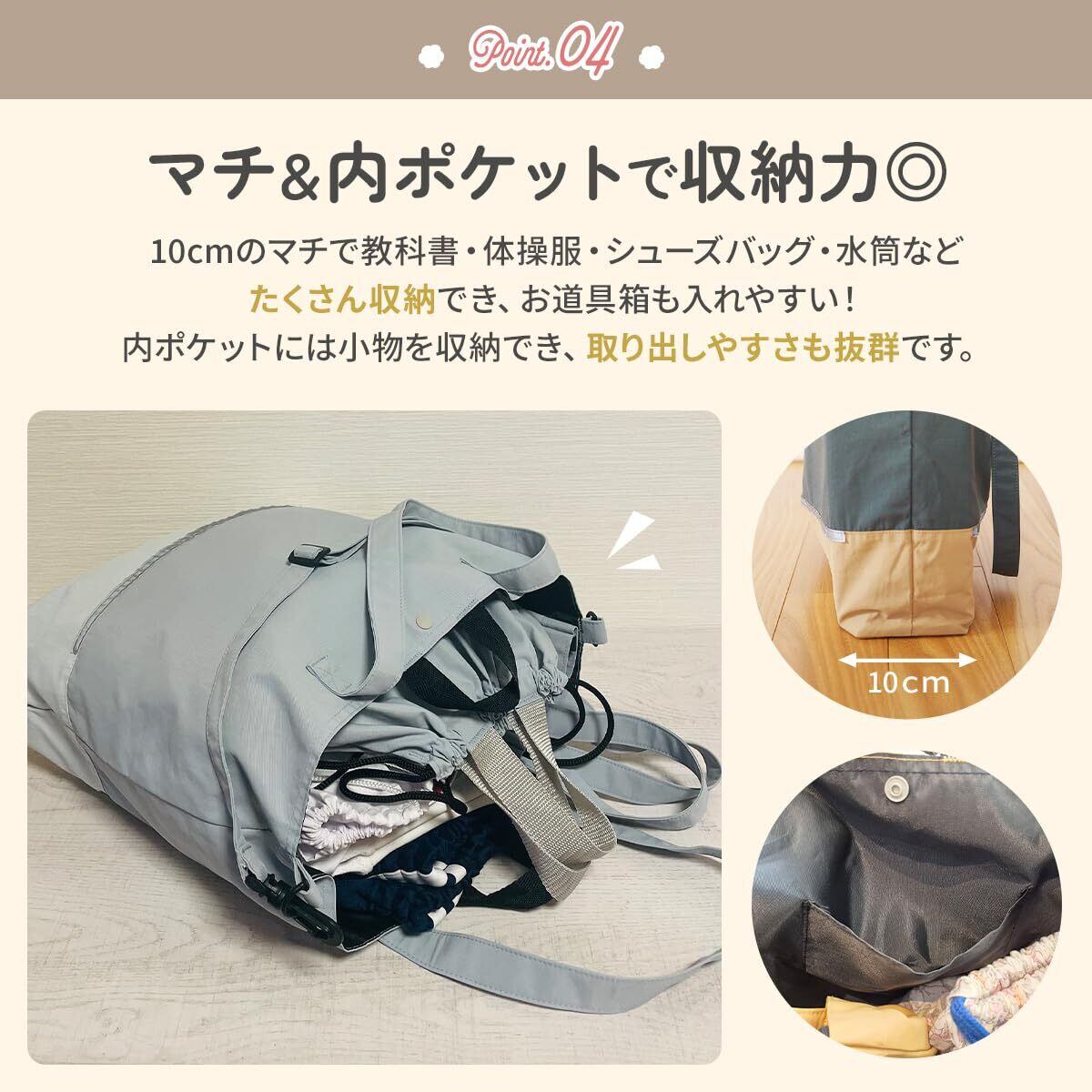 ・対象年齢:小学生 ・組成:綿57% ポリエステル43% ・サイズ:縦33cm×横41cm×マチ10cm 【ショルダー長さ】最長80cm/最短40cm 【持ち手】42cm 【フック用ループ】12cm