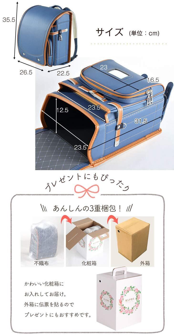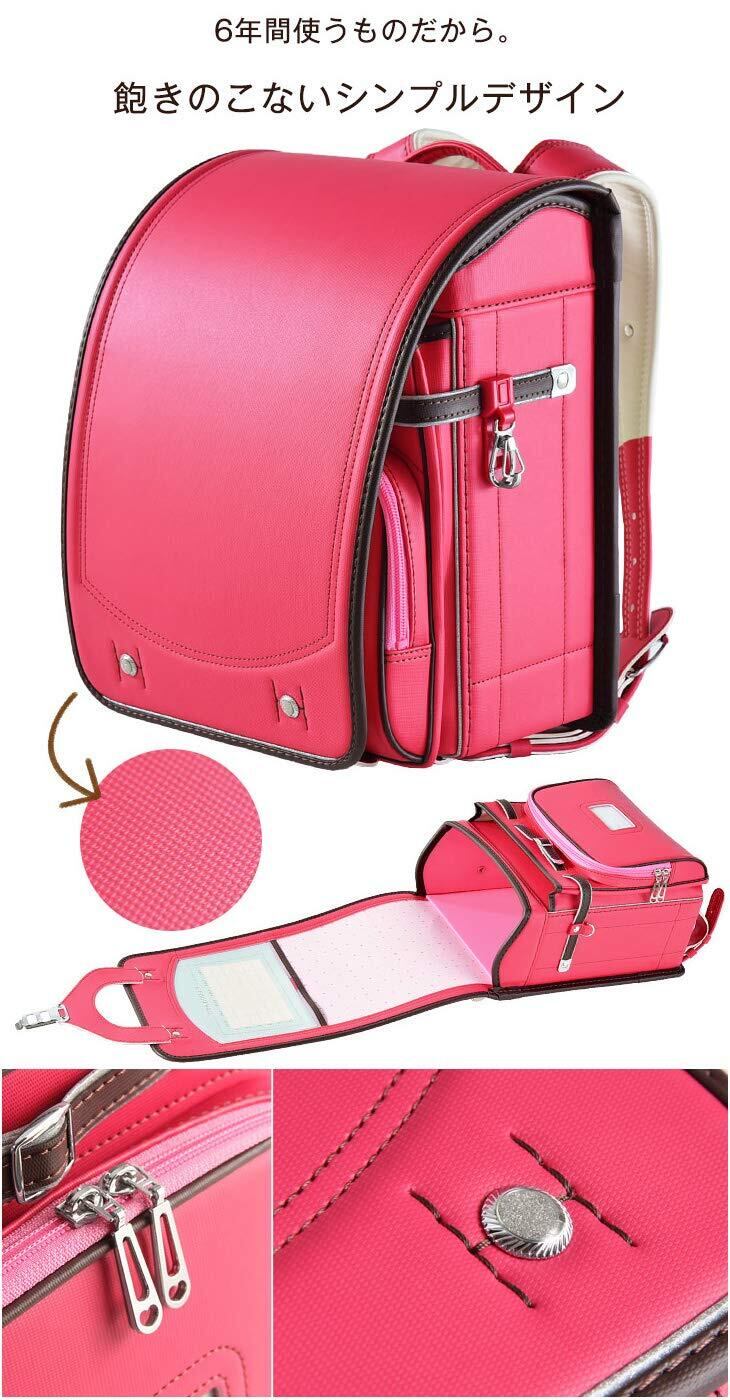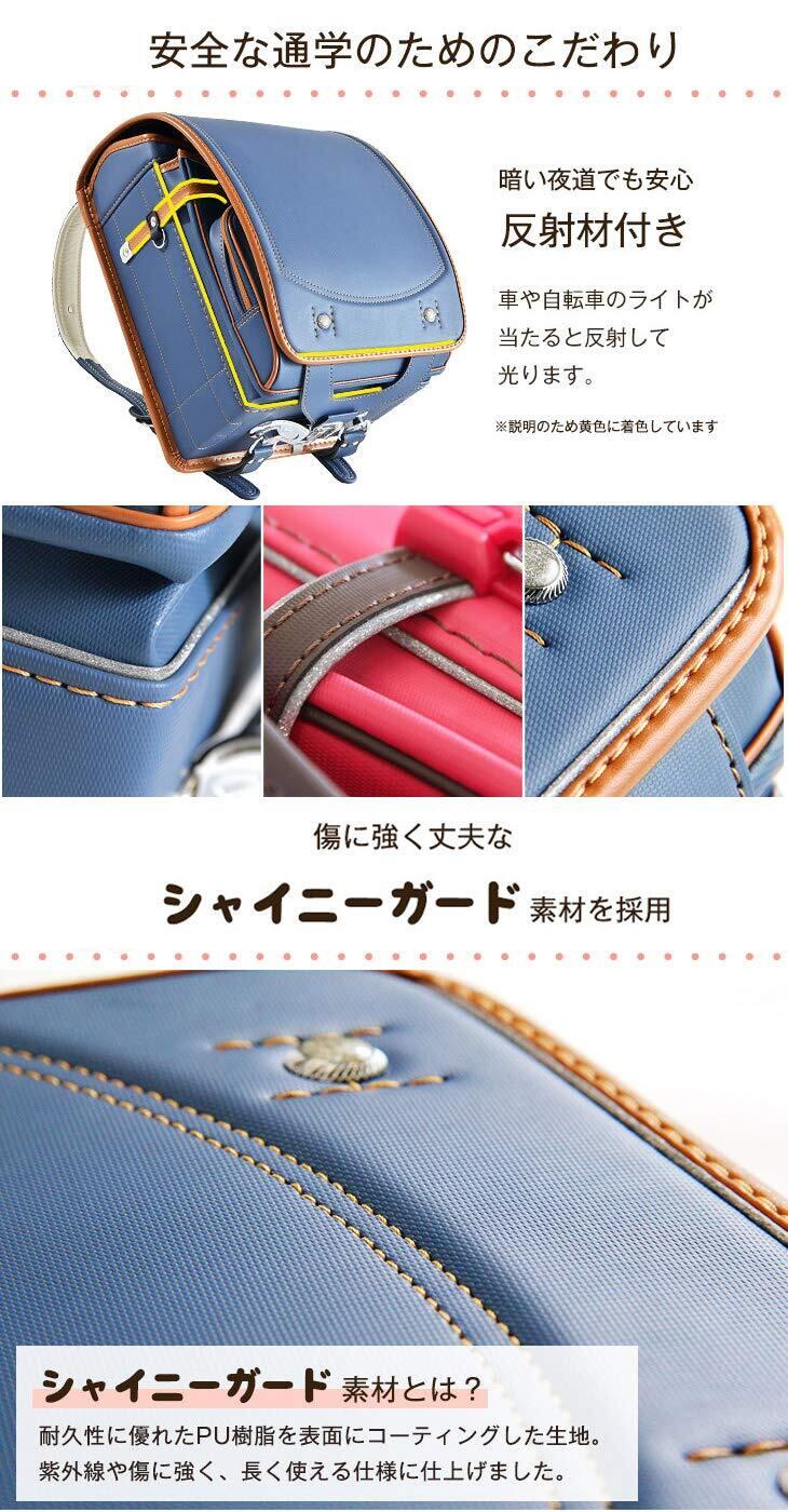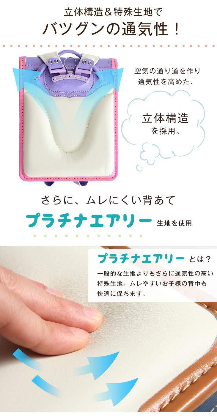 【おすすめポイント!】・自分らしさを育む シンプルデザインのランドセル ・A4フラットファイル対応 ・通気性のいい背面生地を採用! ・背負いやすく体にフィットする、左右独立背カン ・閉め忘れ防止!ワンタッチロック錠 ・時間割り、ネームタグ付き ・ベルト左右に防犯ブザーを付けられるDカン、ナスカン付き ・本体両側にDカン、ナスカン付き ・鍵などの貴重品用に、小ポケット内部にもDカンを付属! ・暗い夜道も安全の反射材付き ・雨の日も安心のランドセルカバーをプレゼント! ・型崩れしにくい一体型フレーム&補強板を採用 ・安心の7年