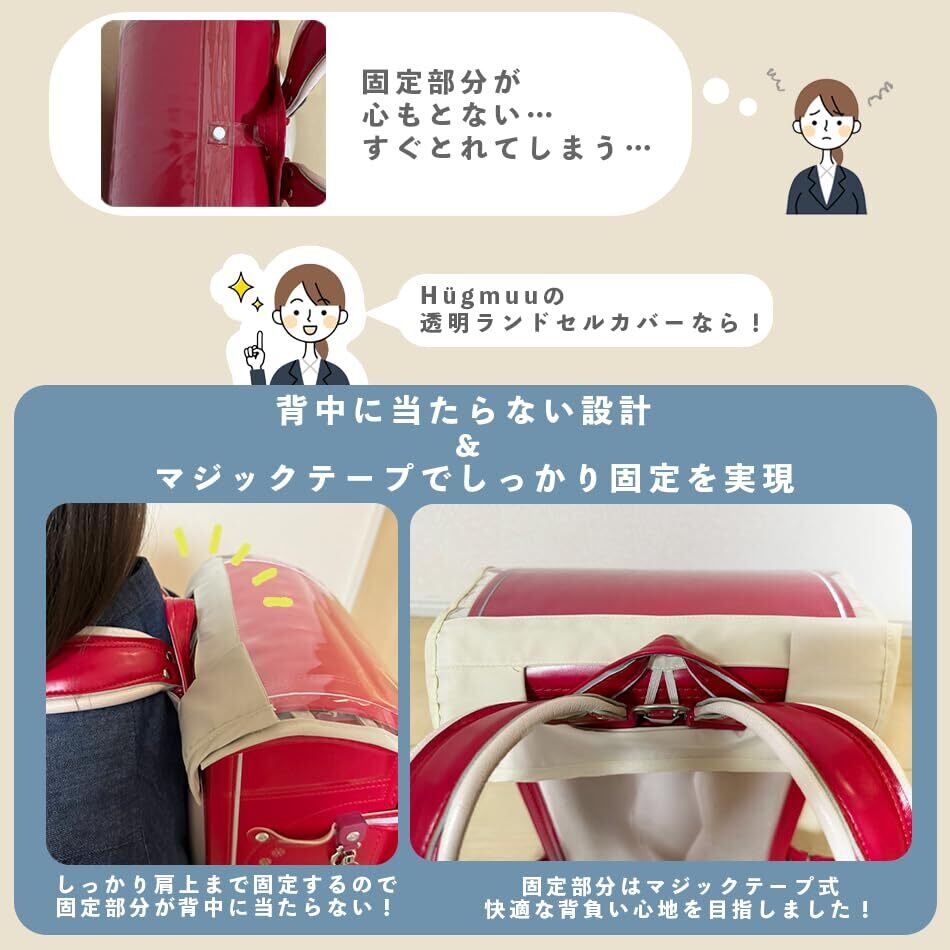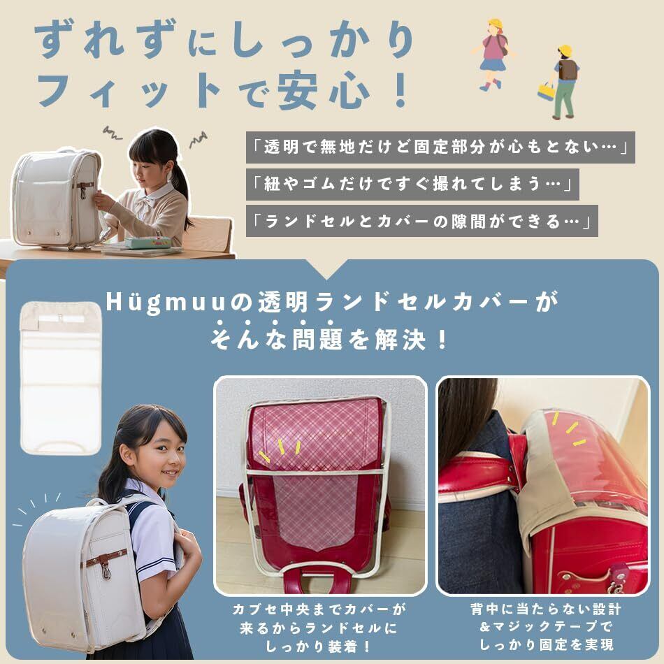 【ずれずにしっかりフィットで安心】透明で無地だけど、上部の固定部分が心もとない…固定方法が紐やゴムだけですぐ取れてしまう、ちぎれてしまう。ランドセルとカバーの隙間ができる。そんな問題を改善できるHügmuu透明ランドセルカバー!縦横共に大きめサイズで企画しています。(サイズ表ご確認頂きお手元のランドセルに合わせてご検討ください。)