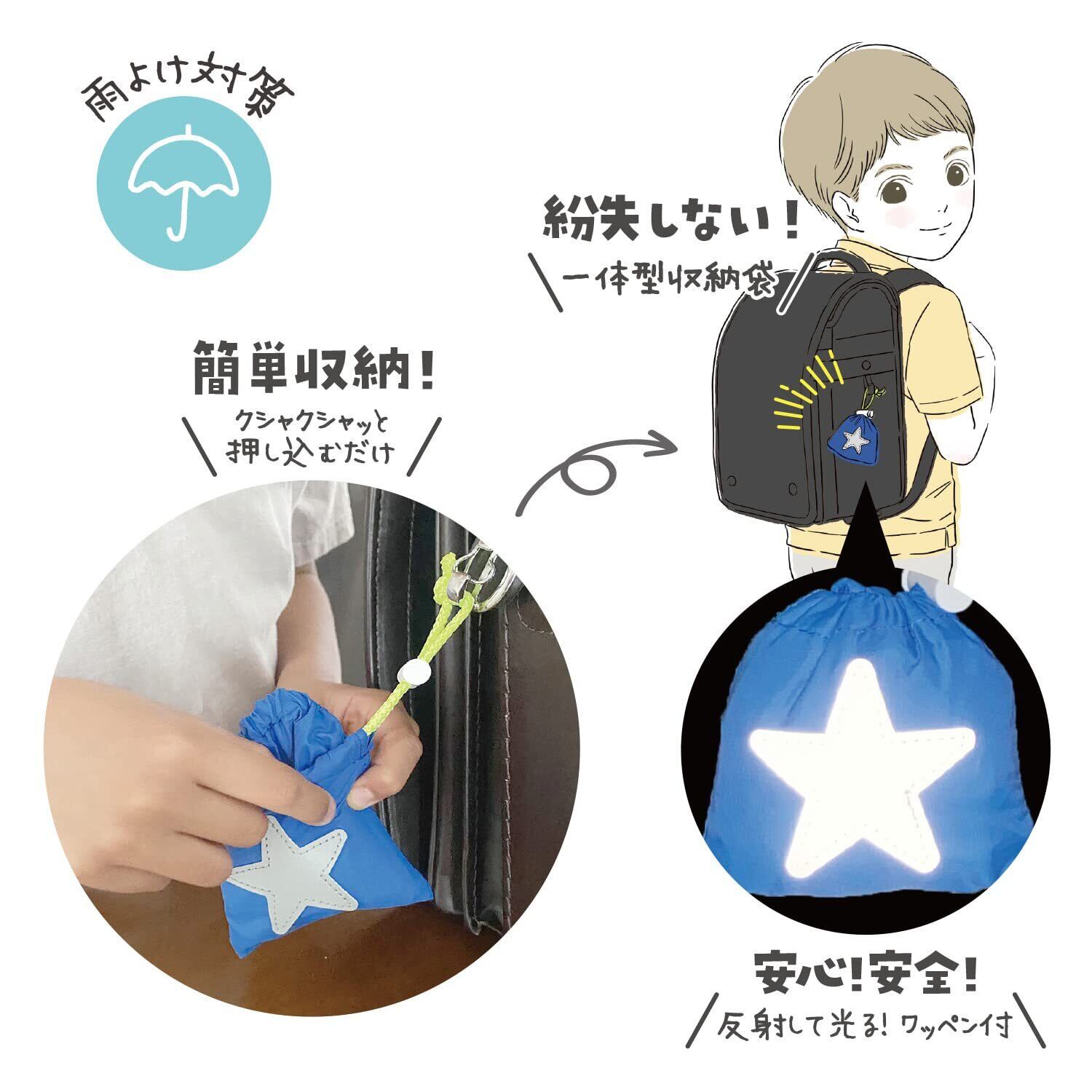 収納袋に反射ワッペンが付いており、雨の日や薄暗い下校時も安心!