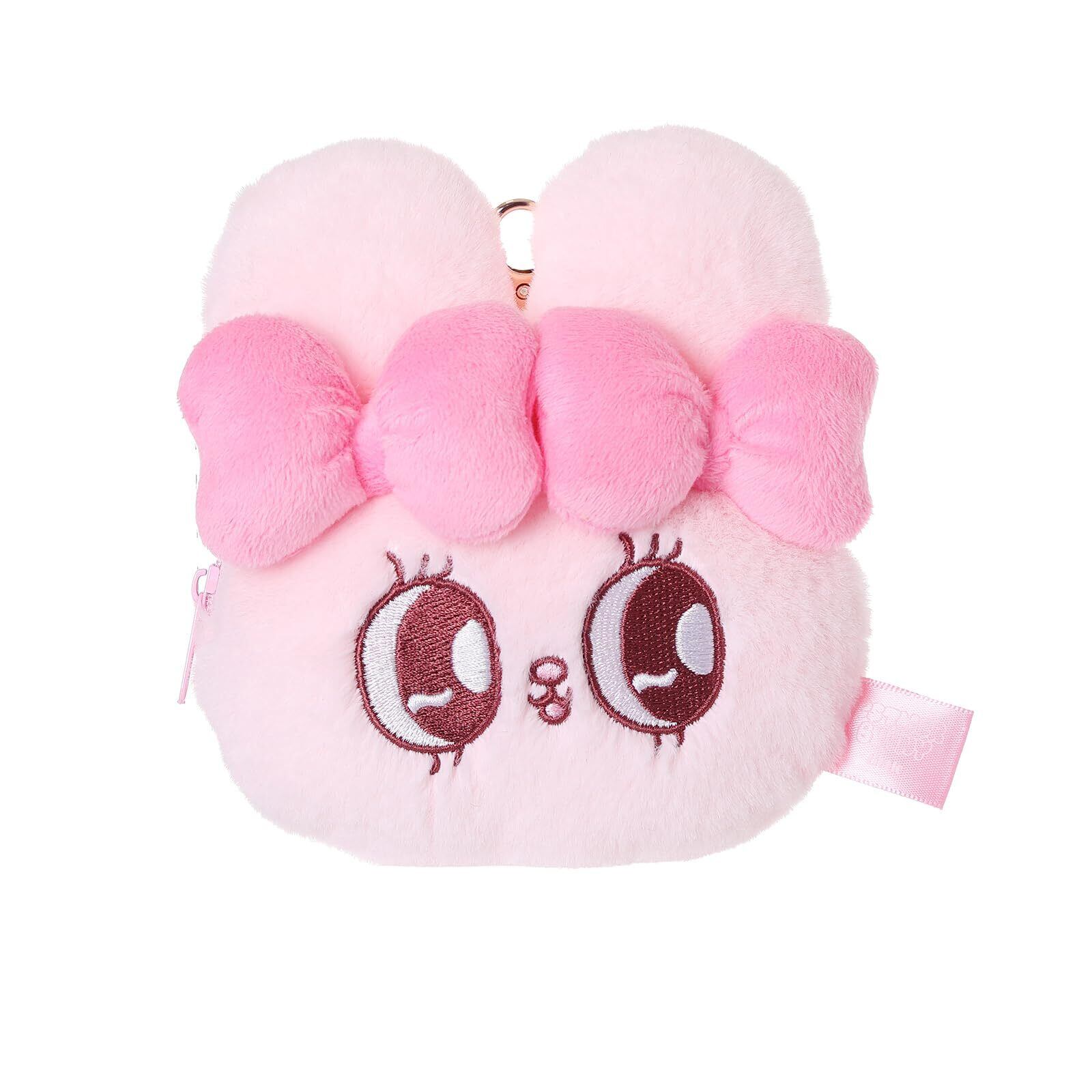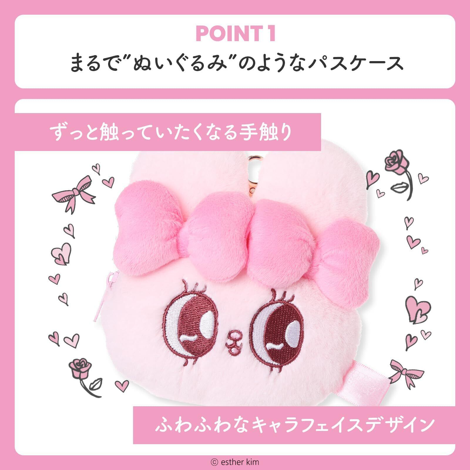 キュートなデザイン: ぬいぐるみのような柔らかいピンクのうさぎキャラクターのパスケースで、ふわふわな手触りと愛らしい表情が特徴です