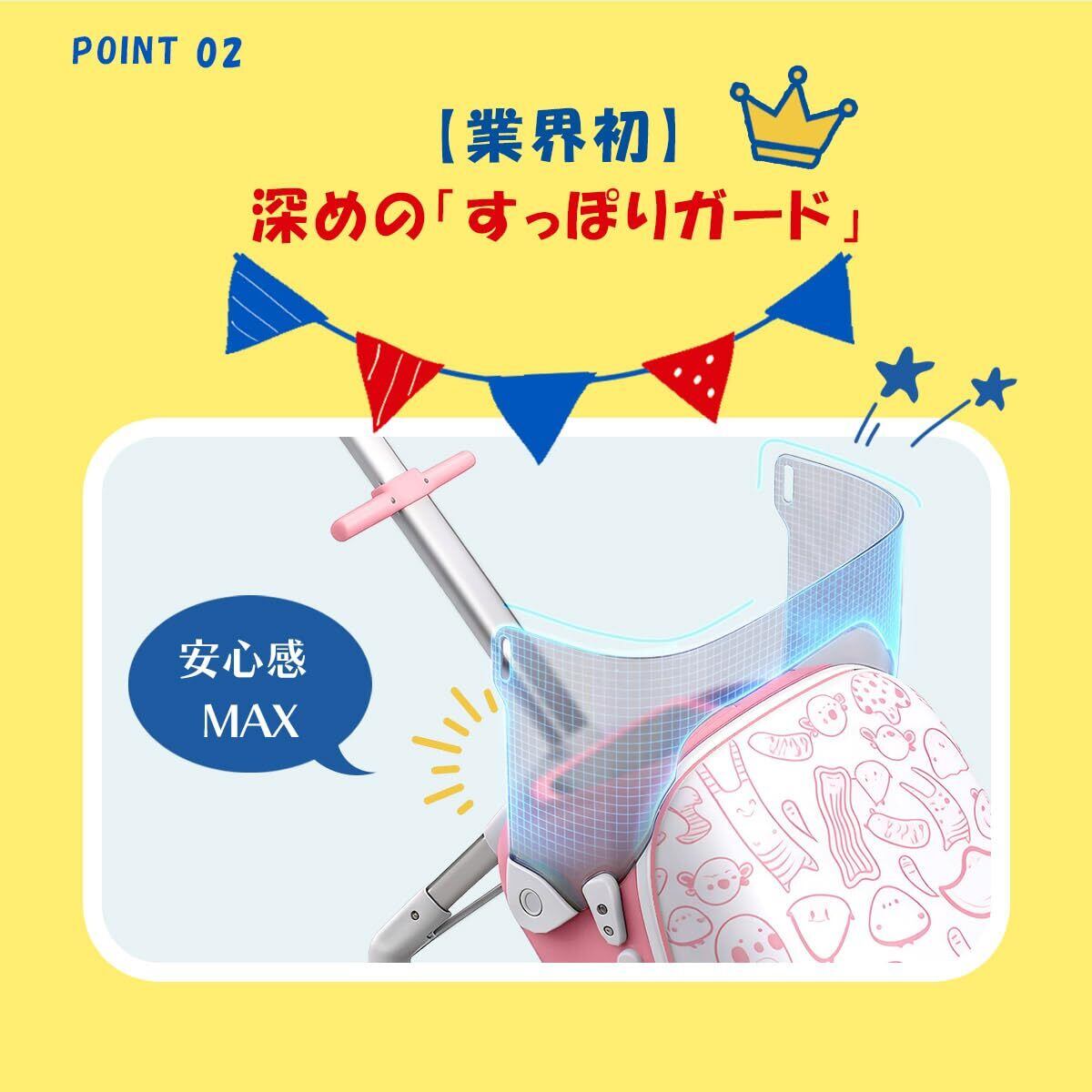 【深めの「すっぽりガード」】包み込まれるような安定感。独自の「深めセーフティガード」を採用しました。腰回りをしっかり包み込む設計で、グラつきを抑えてピタッとフィット。小さなお子様でもバランスを崩しにくく、移動中もしっかりとした安定感を保ちます。