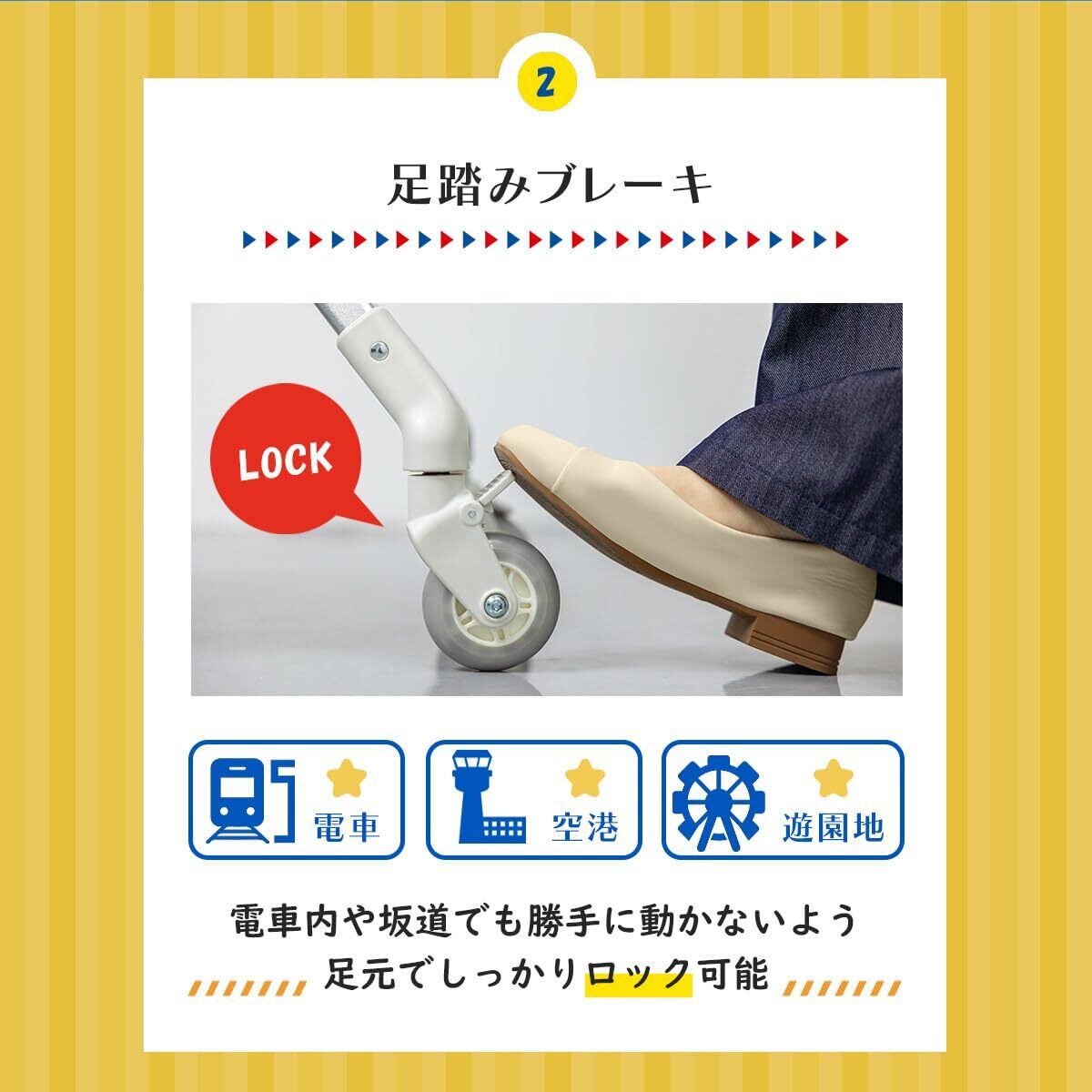 【走行・停止・防犯を支える3つの実用機能】ホールドベルト:体勢をしっかり保持し、移動中の落下や姿勢崩れを防止。足踏みストッパー:ワンタッチで固定。坂道や電車内での自走を防ぎます。TSAロック:施錠したまま預け入れ可能。海外旅行の防犯対策も万全。
