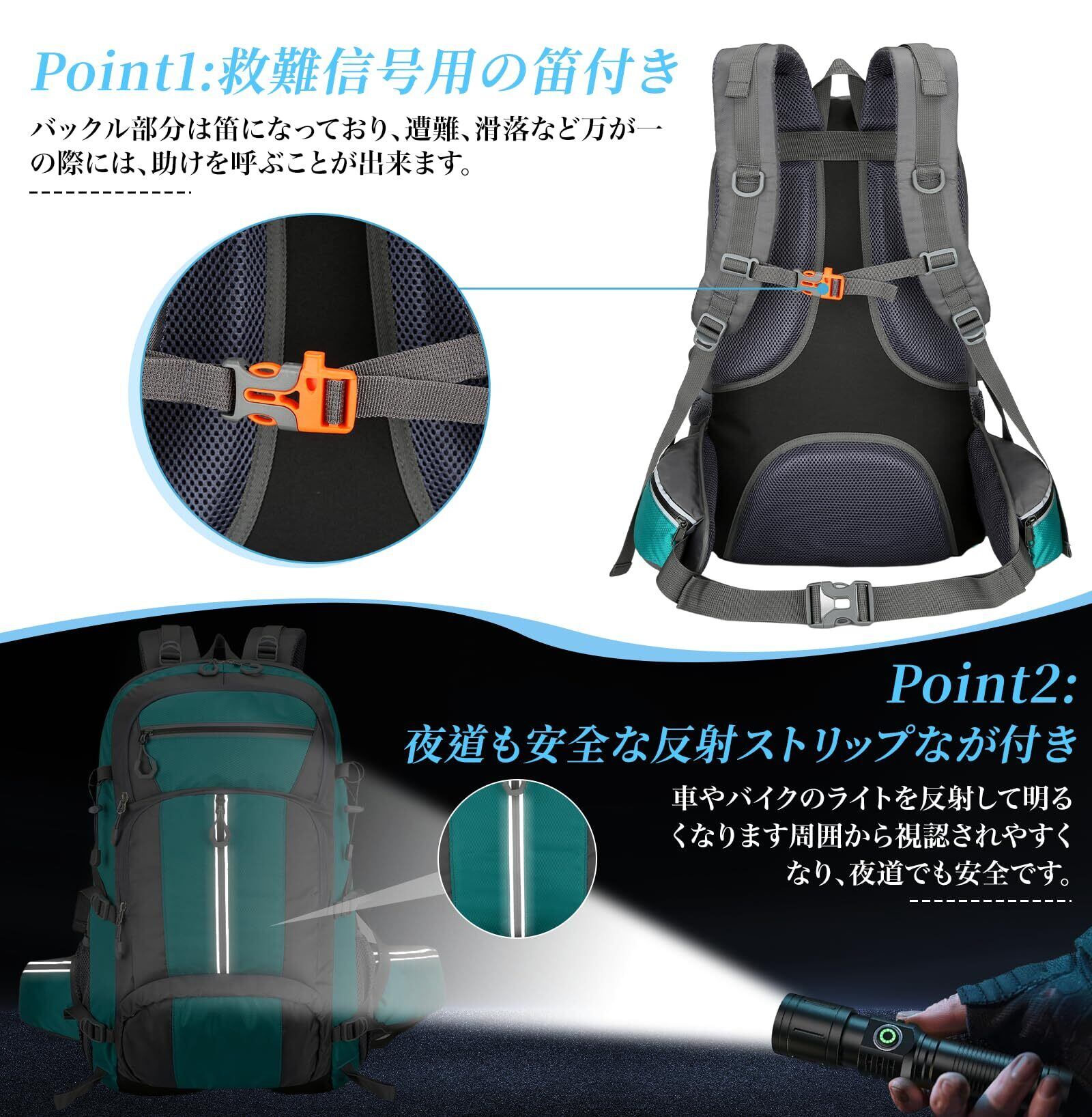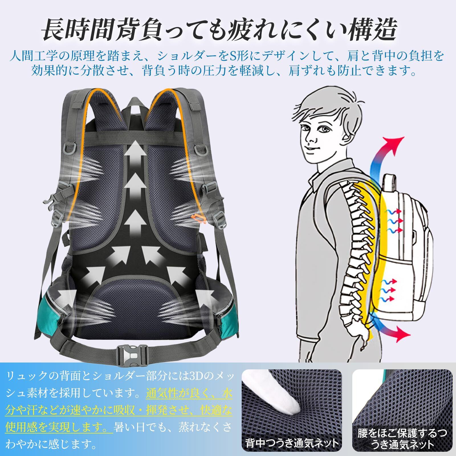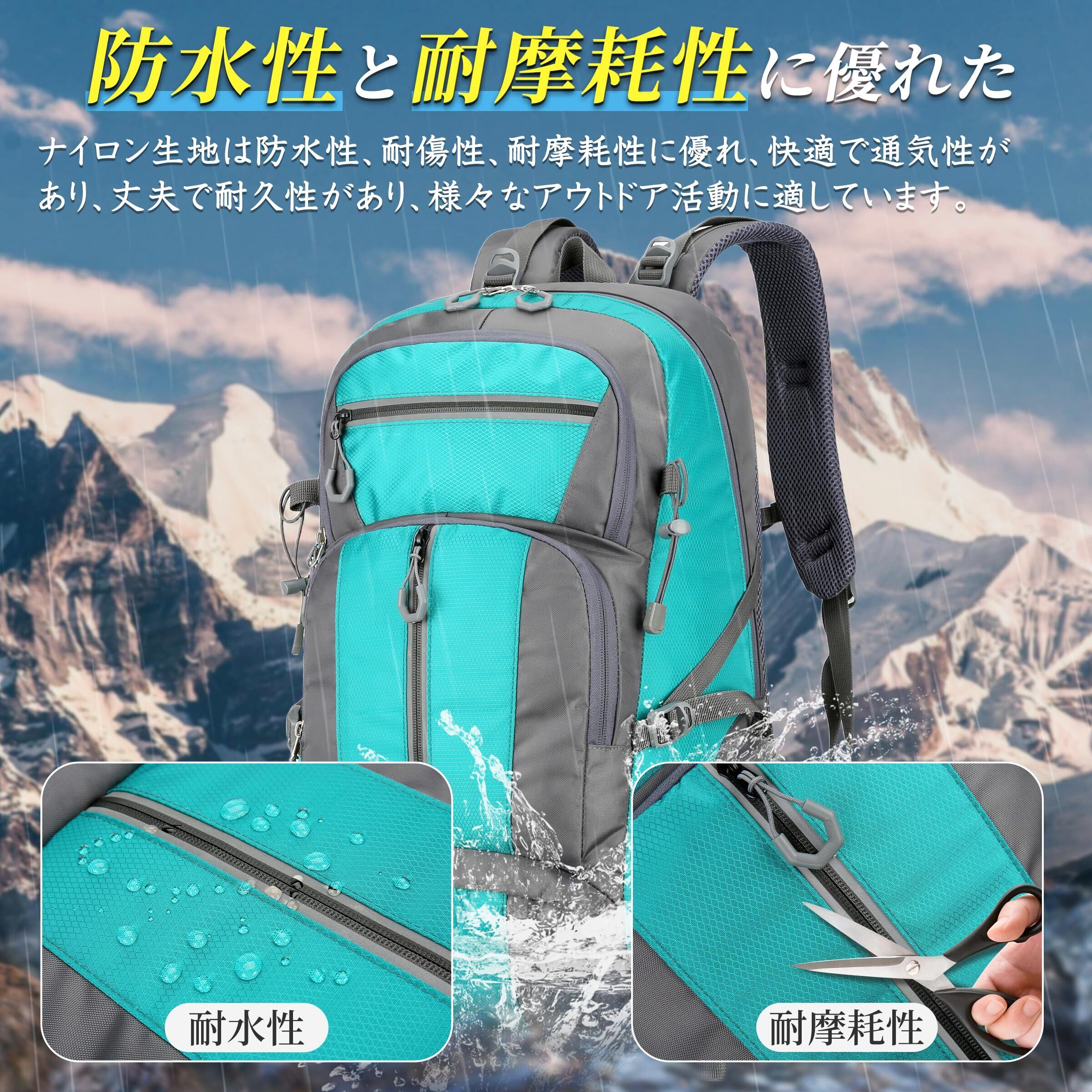 【防水&耐久性】バックパックは防水ナイロン素材で作られており、防水性と汚れに強いです。水をかけても中に浸み込まずに玉になって表面を転がり落ちるので、 突然の雨にも安心です。(注意:登山 リュックは完全防水ではありません、雨が激しく降るとジッパーから水が入る場合があります)、また、バックパックは速乾性があり、洗濯後もすぐに乾くので、使い勝手が良いです。 当社の防水 リュックは、高品質の破れにくい素材、SBSジッパー、高強度ファスナーを採用しており、緩みにくく、壊れにくく。耐久性と耐摩耗性を確保しています。 ストレスポイントが補強されているため、重い物を入れても簡単に壊れず、長持ちする耐久性を提供し、ハイキングやキャンプの冒険に最適です。