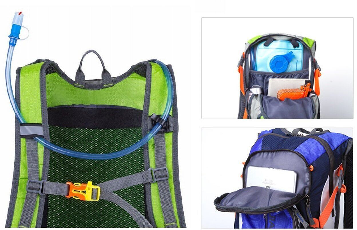 ポケット説明:メインコンパートメントに2-3Lの水袋(同梱されていない)が収納可能です。ハイドレーションバッグとして使用する時は、肩ベルトからチューブを出すことができ、動きながら水分補給ができます。セカンダリーコンパートメントに、タブレットPC、携帯、財布が収納可能です。正面の右側にアクセスしやすいファスナーポケットが一つ、さっと取り出したい物を入れておくと便利です。下部のポケットにヘルメット専用のカバーが入っています。両側に伸縮性がある綱袋が二つ、水筒やペットボトルが収納可能です。