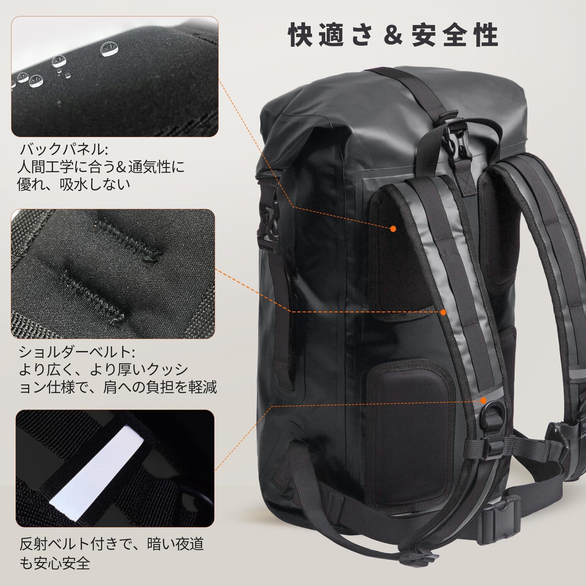 【快適性&安全性】人間工学に基づいた防水バックには背面には移動中の蒸れを防いでくれるクッション性にすぐれたメッシュパネルが採用されています。ストラップはネオプレン素材と通気性メッシュの内側にスポンジライナーを使用しており、防水性と通気性に優れ、背中や肩への負担も軽減します。ショルダーストラップとタワーバックルはすべて調節可能で、身長や体型に合わせて快適な長さを設定できます。また、バックに反射図案付き、光を反射でき、夜間走行の安全性を高めます。