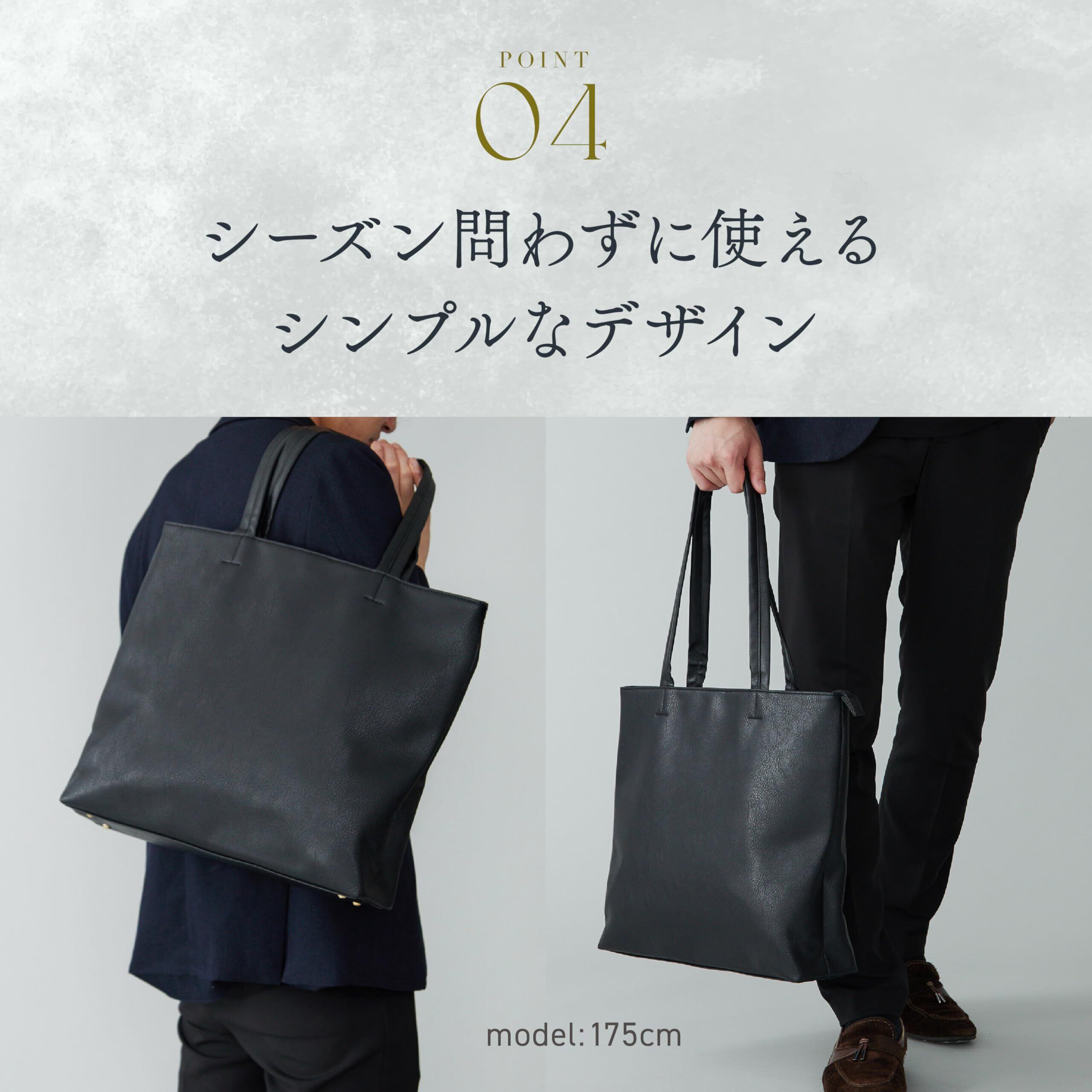 【収納力】A4サイズの書類やファイルが縦向きでも横向きでも収納できる大きさで、荷物が多いときでもスタイリッシュなデザインを損ないません。バッグの中で折れ曲がったりシワになったりしてしまいがちな、大きめサイズの書類がすっぽり収まります。