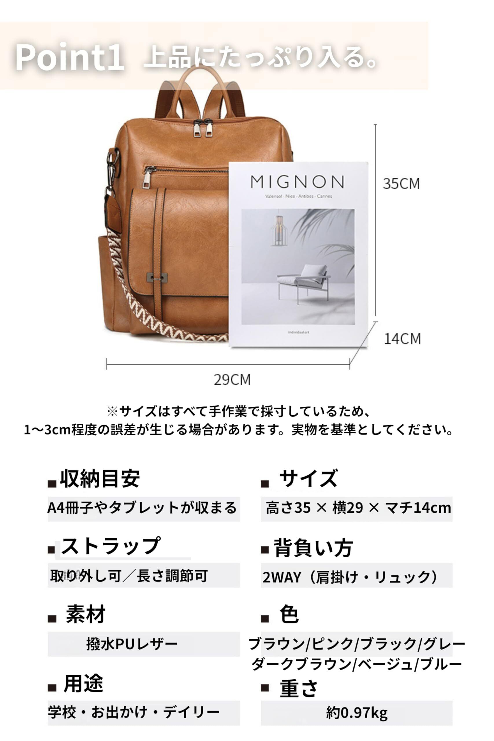 リュックとして両手フリーで使えるのはもちろん、ショルダーバッグ風にも持てる2WAY仕様。荷物量やシーンに合わせてスタイルを切り替えできます。ストラップは長さ調節可能で肩にしっかりフィット。長時間背負っても負担を感じにくい設計です。