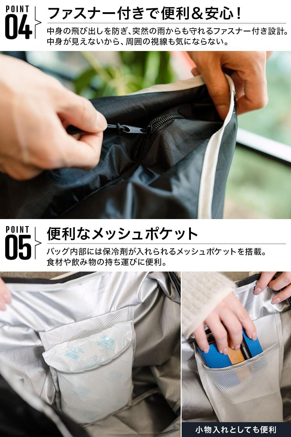 【機能】 大容量、軽量、折りたたみ可能、作りが丈夫で長持ち、ファスナー付きで中身を守る、マチ付きでお弁当を入れても偏らない、うれしい保冷・保温・撥水機能付き、持ち手クッション付きで重い荷物でも手や肩が痛くなりにくい