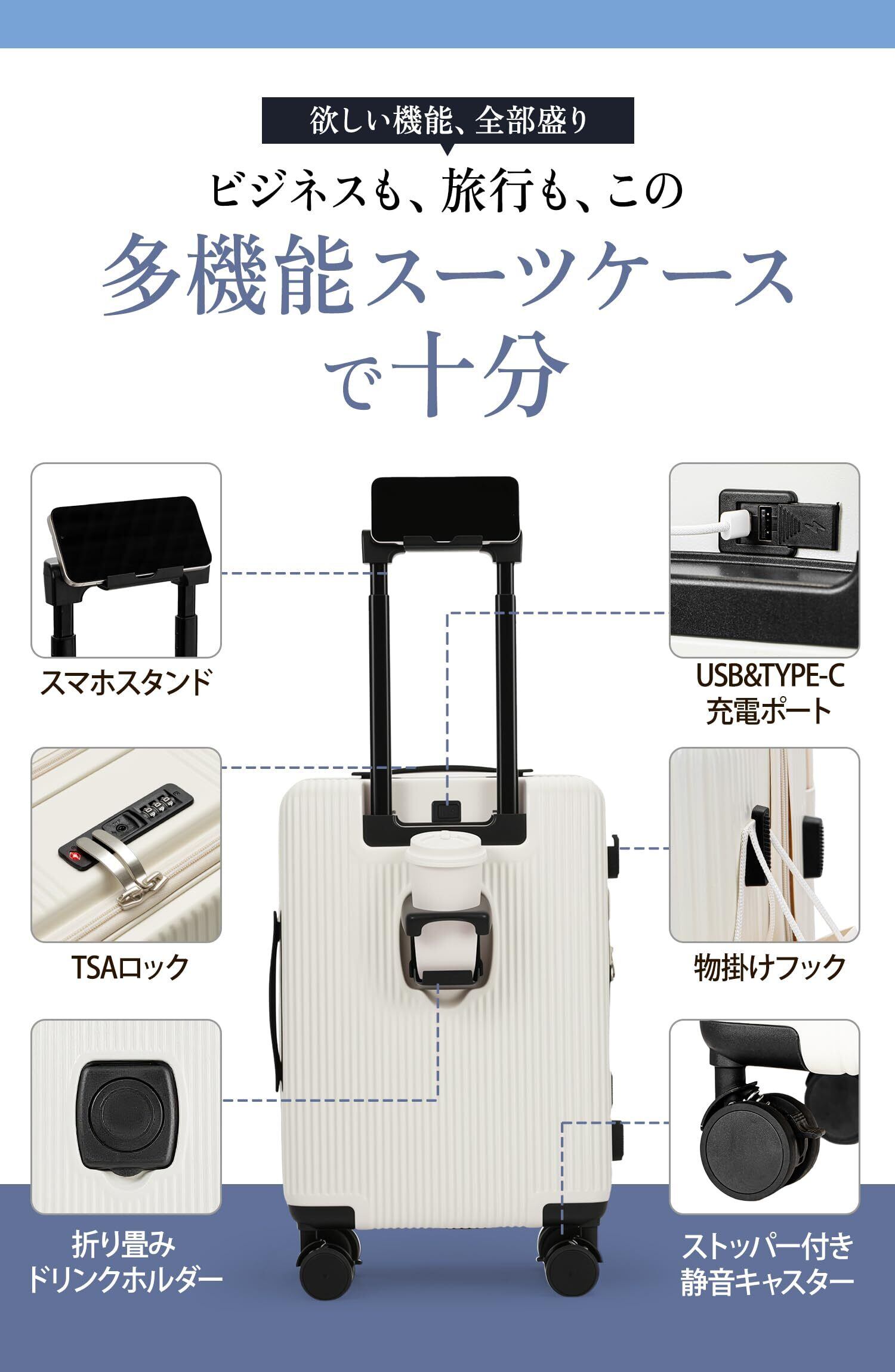 【スーツケース 機内持ち込み・多機能・キャスター ストッパー付き ・USB+Type C充電ポート付き ・カップホルダーとスマホルダーを付く】スーツケースにモバイルバッテリーを収納するポケットがついており、 USB+Type Cポートの充電口が外にあることで、いつでもどこでも充電できます。便利な折りたたみ式ドリンクホルダー付き。バックカップホルダー、ミルクティーカップ、傘いつでも配置でき、旅行をより便利にすることができます。レバーの上部にはスマホルダーが付いているので、フライトの待ち時間に両手が自由になり、外出先でもリラックスできます。