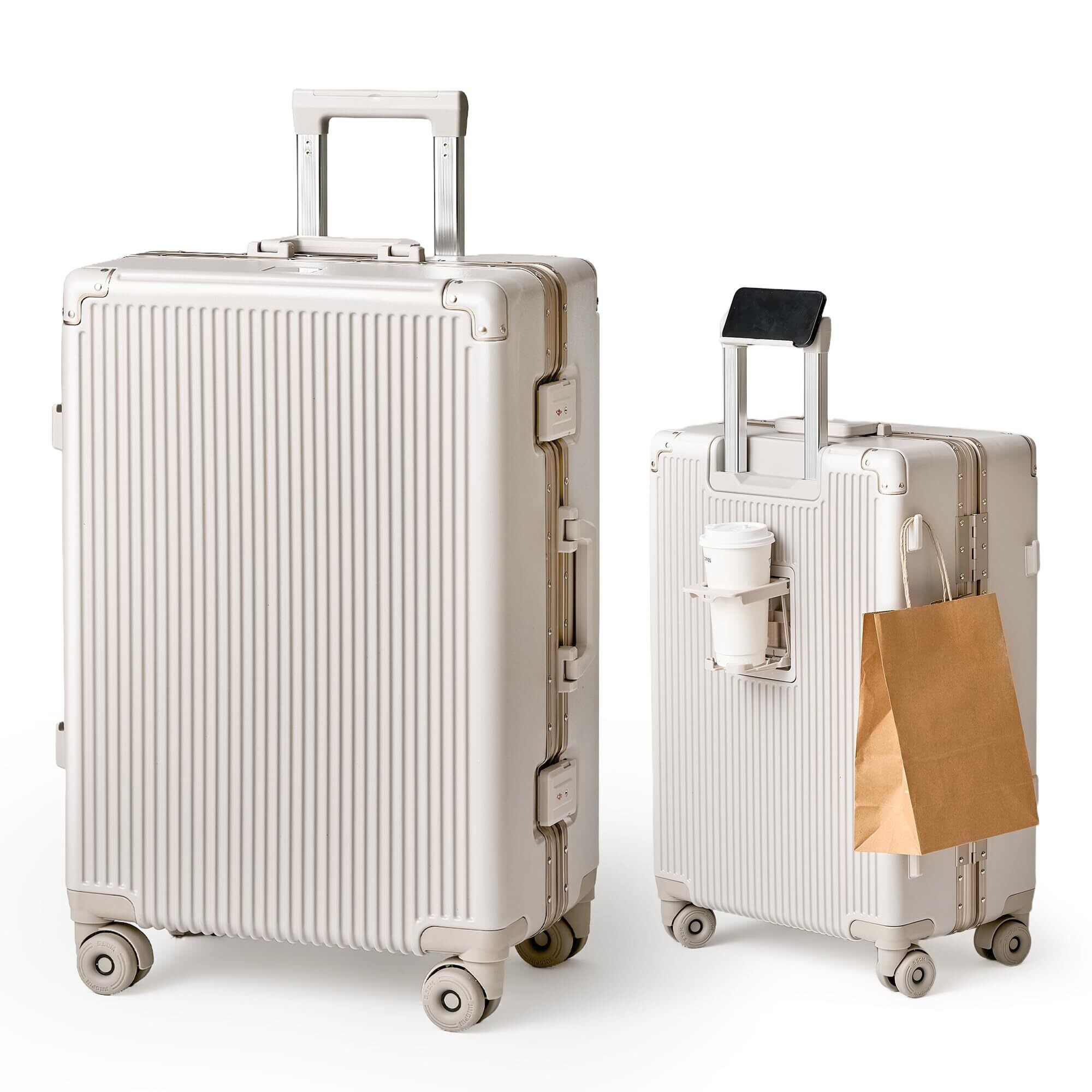 [Yuweijie] 進化形! スーツケース 大型 ワンタッチ式カップホルダー キャリーケース 超軽量アルミフレーム 静音ダブルキャスター 大容量スーツケース 機内持ち込み対応 TSAロック 疲れない設計 ビジネス 旅行 入学祝い おしゃれ XLサイズ オートミール 100L 10泊以上