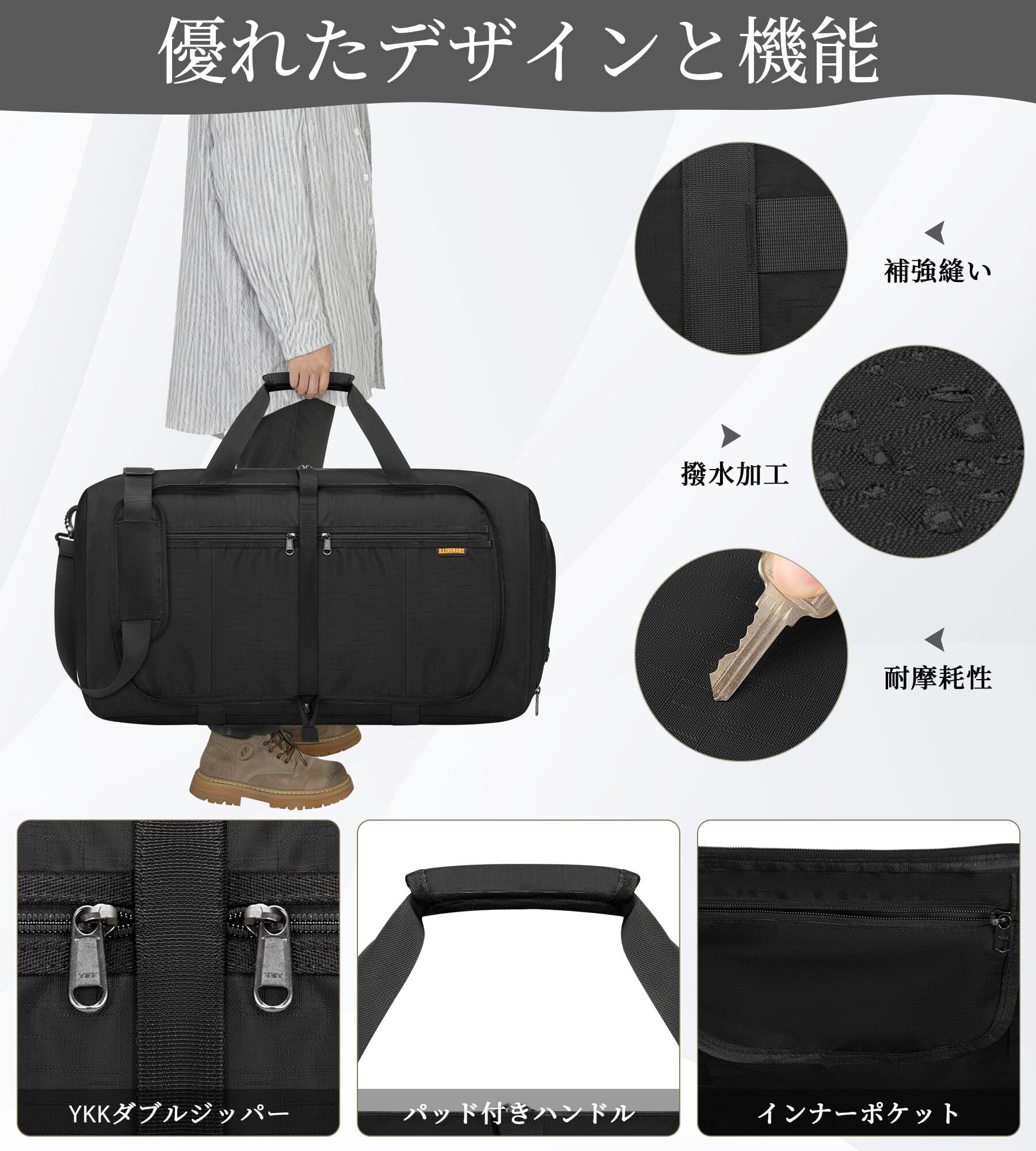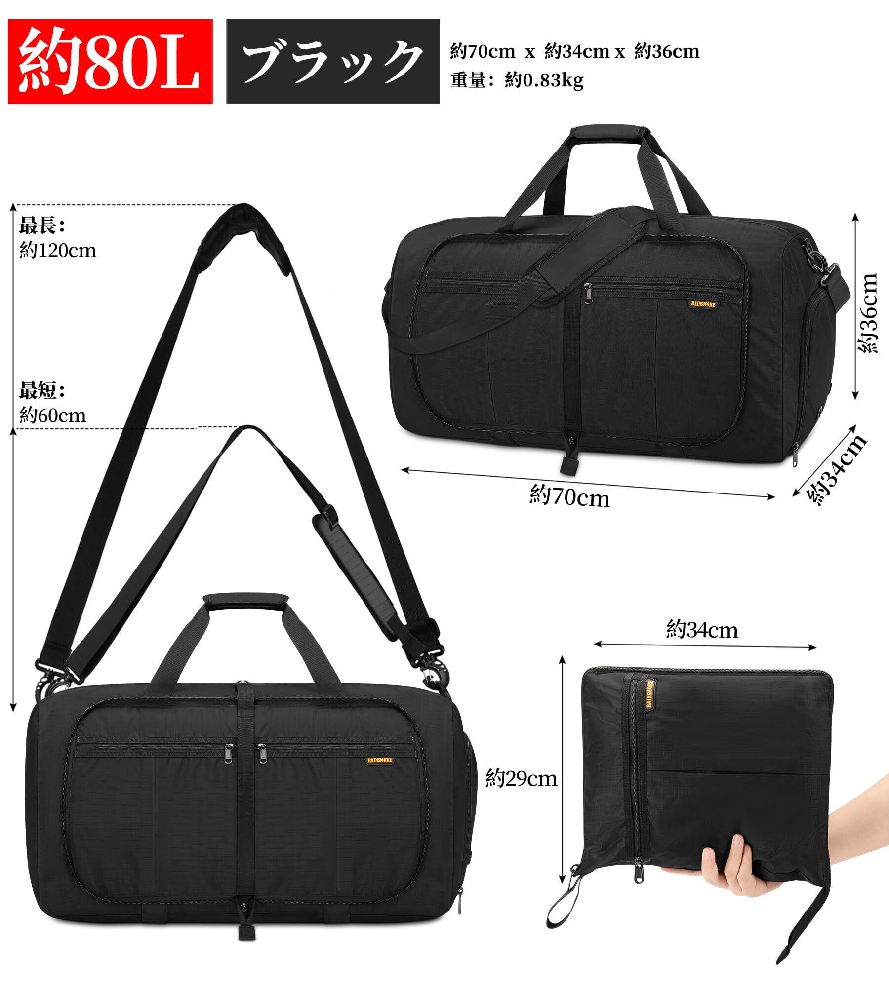旅行バッグ 1泊2日 2泊3日 ボストンバッグ 折りたたみ 大容量 80L スポーツバッグ 旅行カバン トラベルバッグ ジムバッグ 修学旅行 YKKファスナー 撥水加工 ダッフルバッグ シューズ収納 乾湿分離 3way 出張 ブラック