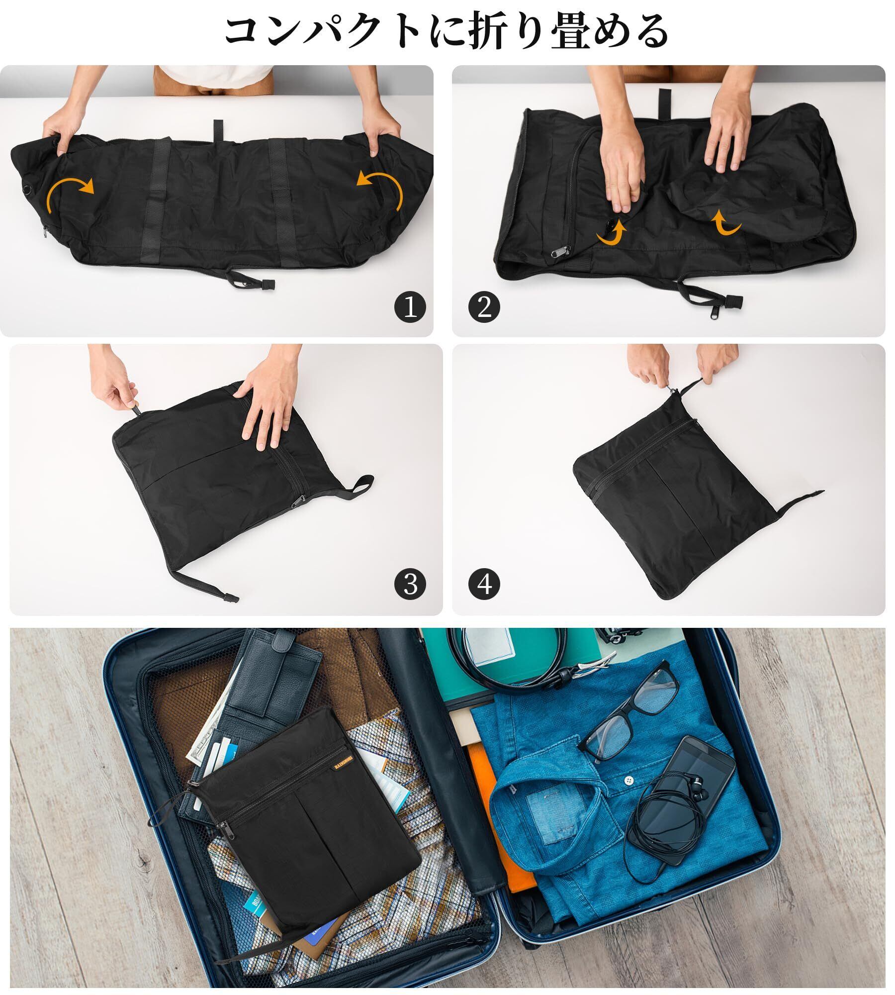 【コンパクトな折り畳み収納】使用後は、本体に組み込まれたファスナーを引くだけで、あっという間にコンパクトなサイズに折りたたみ可能。特別な収納袋は不要で、バッグ自体がそのまま収納袋に早変わりします。クローゼットの隙間や棚の奥など、限られたスペースを有効活用でき、出張や旅行が突然入っても、サッと取り出してすぐにご使用いただけます。