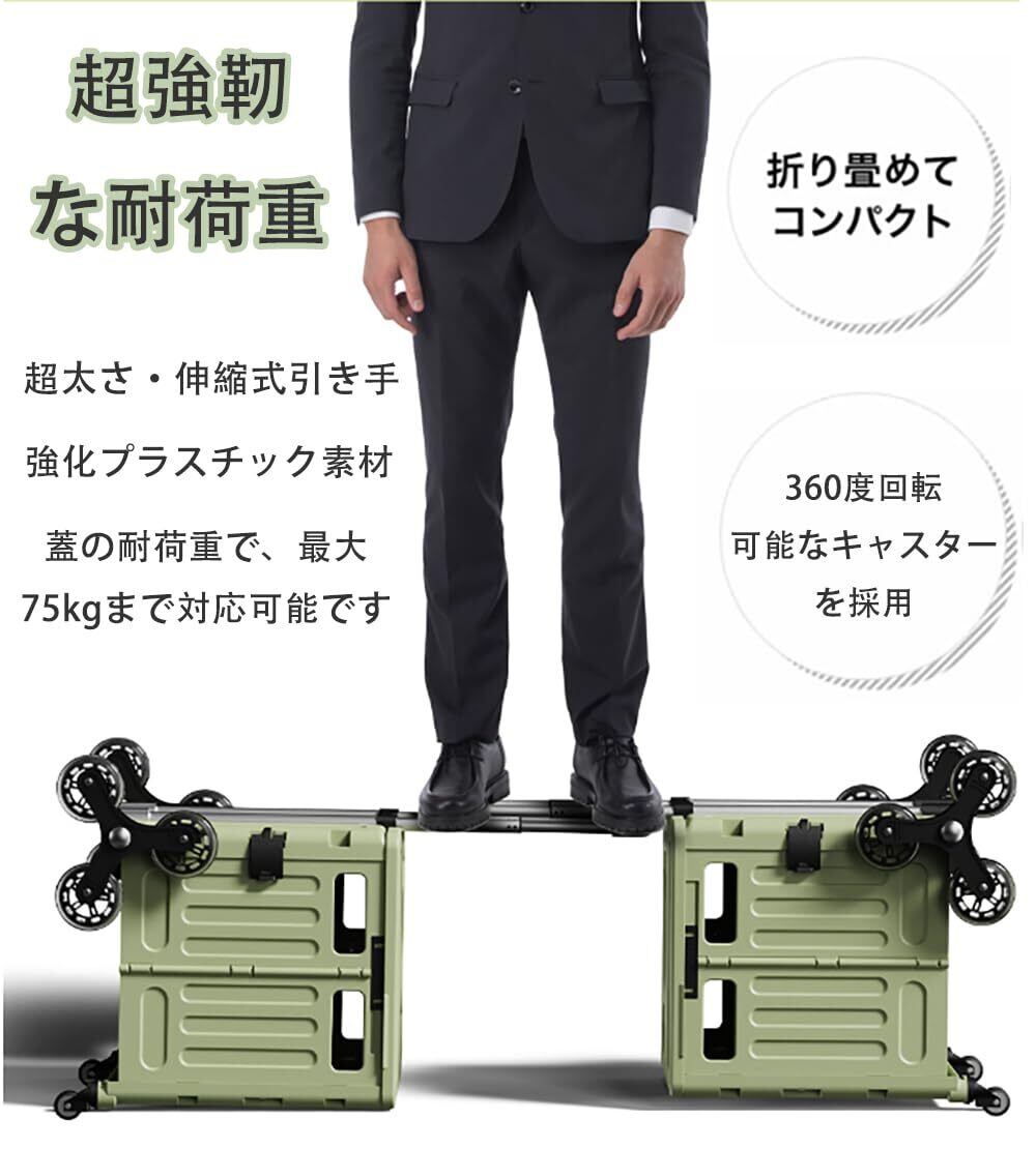 【頑丈な構造と優れた積載性能】折りたたみキャリーカートは高強度のPP樹脂と軽量でしなやかなアルミニウムフレームを組み合わせております。特におすすめしたいのが、蓋の耐荷重で、最大75kgまで対応可能です。日々の買い物はもちろん、ガーデニング資材の運搬やアウトドア用品の収納など、様々なシーンでお役立ちいただけます。素材そのものが持つ耐久性で、長くご愛用いただけます。