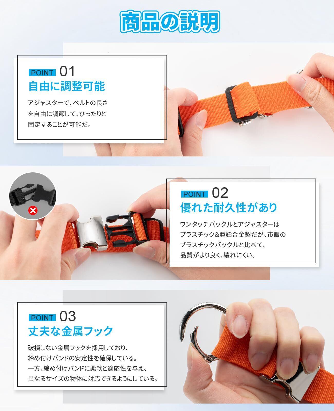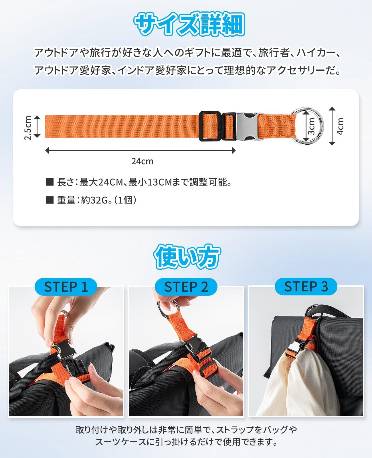 【商品仕様】荷物ストラップは1本だ。調整範囲:最大約24cm、最小約13cmまで調整可能。幅:約2.5cm。重さ:約32g。材質:プラスチック、亜鉛合金。カラー:ブラック、シルバーグレー、カーキ、ライトブルー、レッド、オレンジ。