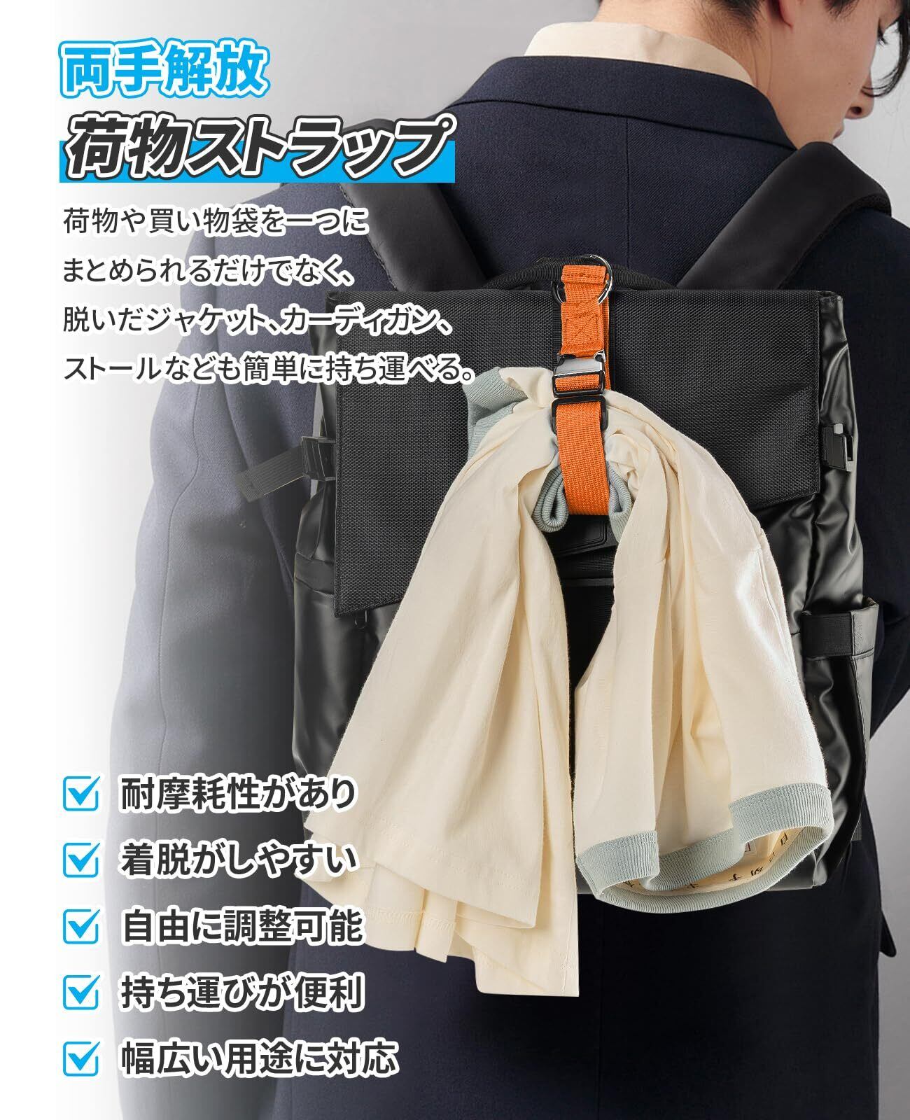 【気配り設計】ジャケットホルダーはアジャスターでベルトの長さを自由に調節できる。異なるサイズの荷物にフィットさせるため、実際のニーズに応じて自由に調整することができる。しかも、ベルトは、より耐摩耗性に優れた技術を採用している。