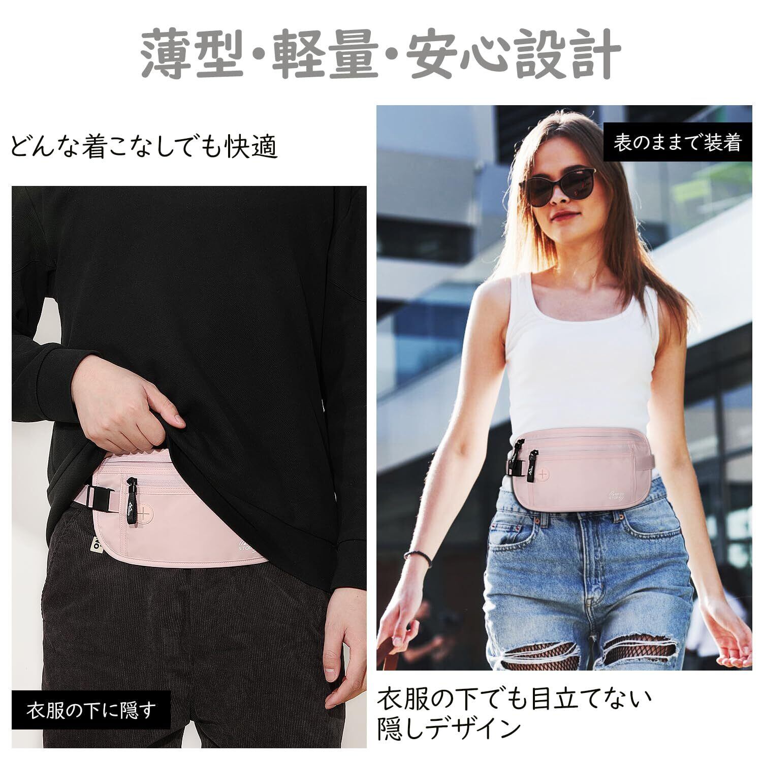 「安心防犯設計で貴重品を徹底保護」当製品は210Dで3mmの特殊薄型のナイロン素材を採用しており、衣服の下に完全に密着するため、外からは全く存在がわかりません。特に内側に設置されたRFIDブロック機能付き防犯ポケットは、電子スキミングを防止し、クレジットカードやパスポートのデータ盗難からも守ります。旅行先の空港や観光地、混雑した電車内など、スリの危険が高い環境でも、貴重品を肌身離さず保管できるのが最大の特徴です。ポケット内部には滑り止め加工も施しており、走ったり急いだりする際にも中身が飛び出す心配がありません。