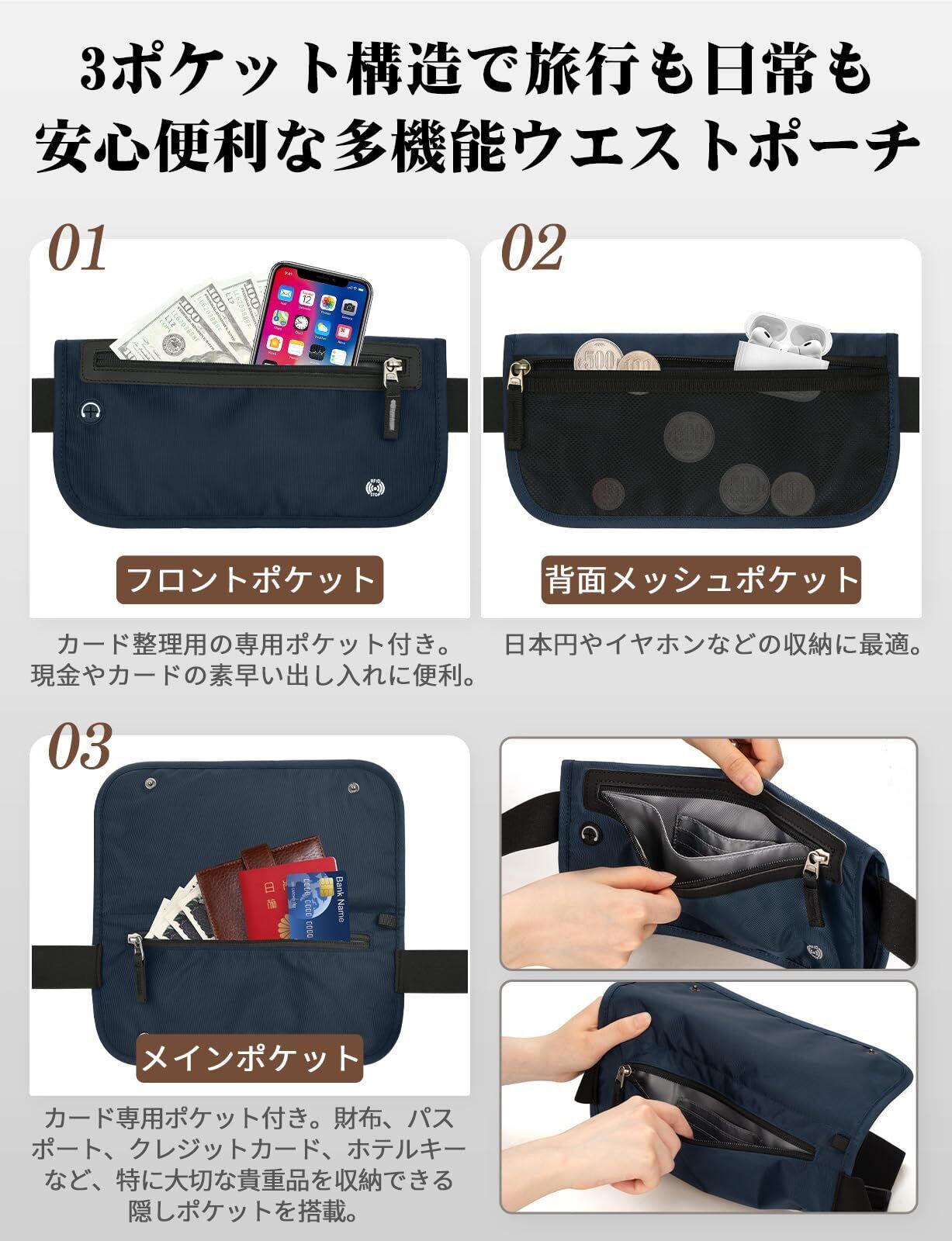 Mellbree セキュリティポーチ スキミング防止 防犯グッズ ウエストポーチ スリ対策 海外旅行用 貴重品ポーチ 薄型軽量 RFIDブロック 多機能収納 メンズ/レディース対応 防水仕様 旅行便利グッズ 防犯バッグ シークレットポーチ 日常/ランニング/海外旅行対応 (ネイビー)