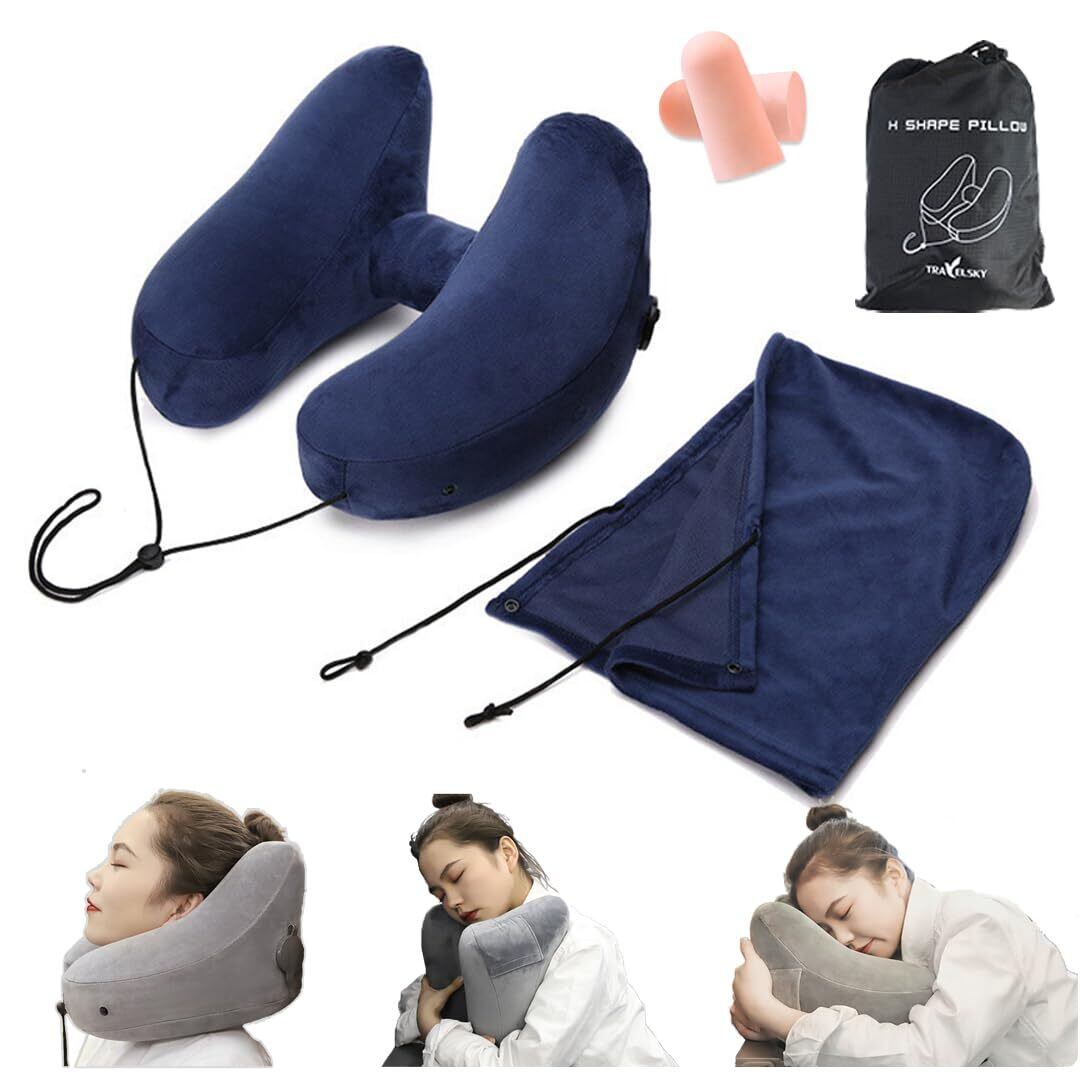 【在庫セール】ネックピロー 飛行機 子供 車 夜行バス クッション 旅行 フード付き 帽子付き 首枕 エアー 低反発 海外旅行 女性 機内 バス 新幹線 エアーピロー ネッククッション 旅行 出張 昼寝 移動 空気枕 携帯枕 軽量 オフィス 丸洗い 携帯枕 旅行グッズ 誕生日 ギフト プレゼント (ネイビー)