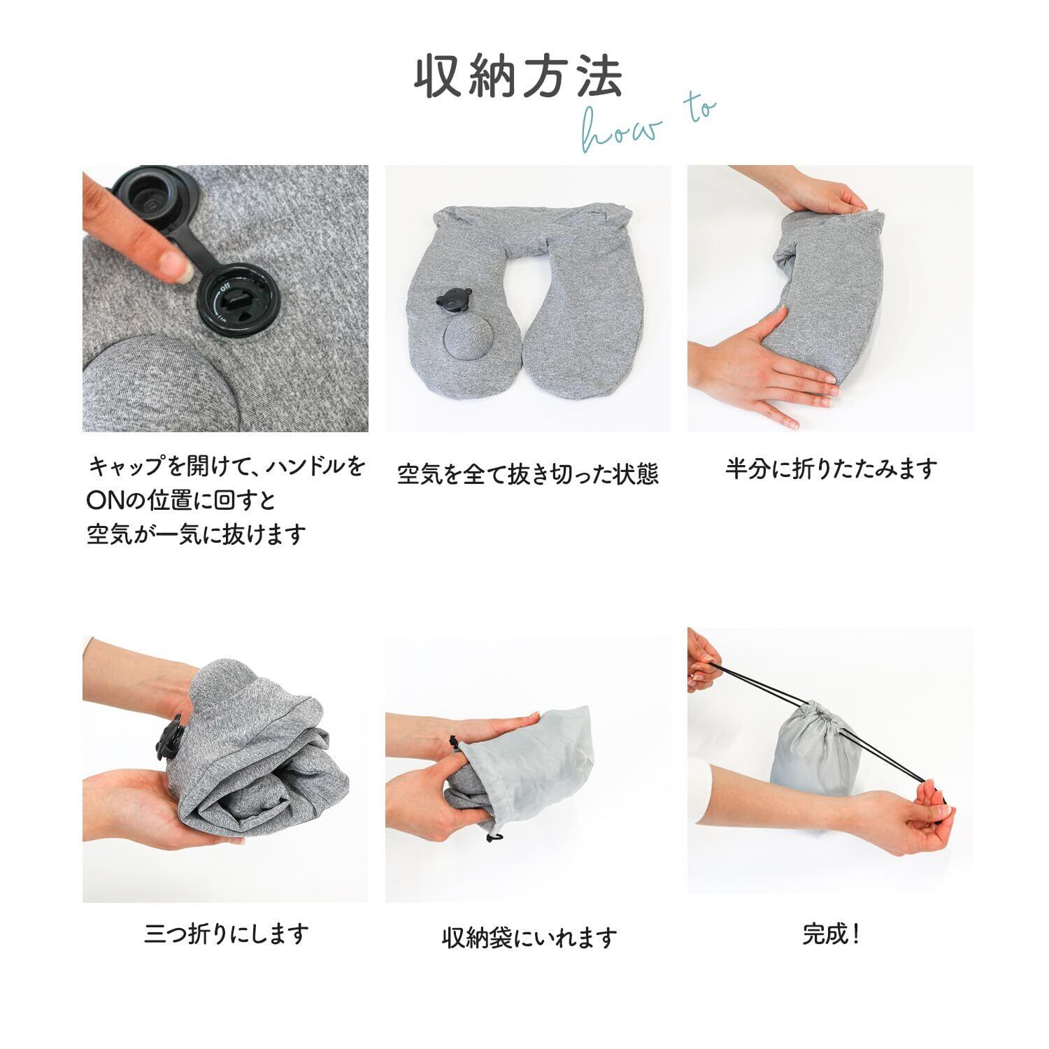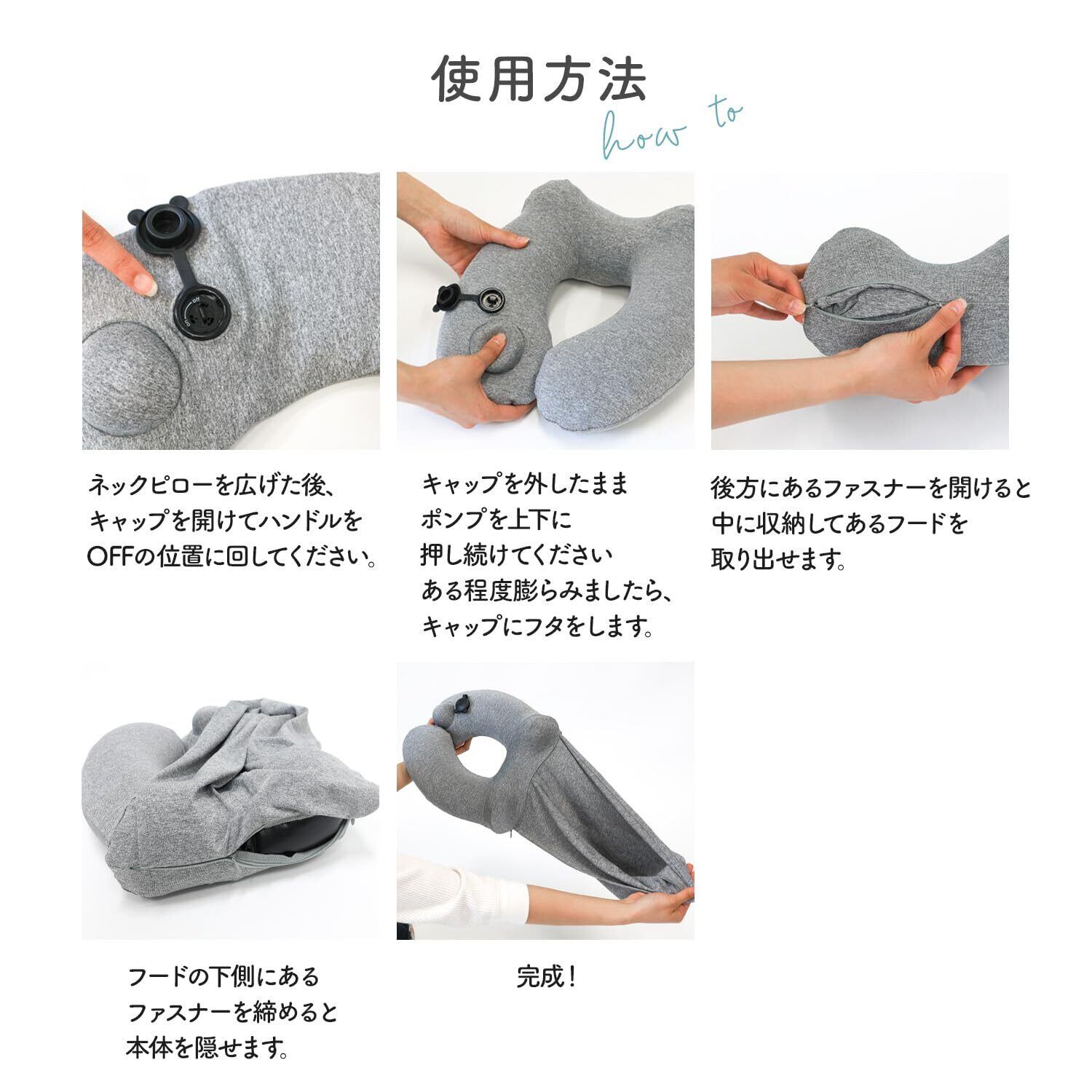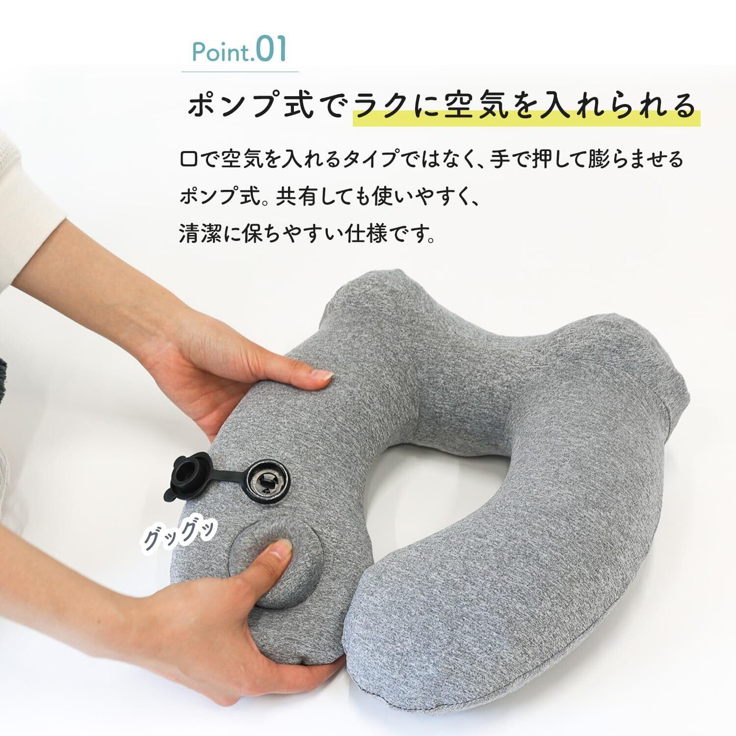 【こだわりポイント】手で押して膨らませるポンプ式で、口で空気を入れないため衛生的でラクに使用できます。ご家族やカップルでも共有しやすい仕様です。心地よいクールクロス素材を採用し、季節を問わず快適にご利用いただけます。さらにカバーは取り外して洗濯可能なので、清潔に保てます。長時間の移動シーンでも、やさしい使い心地でリラックスをサポートします。