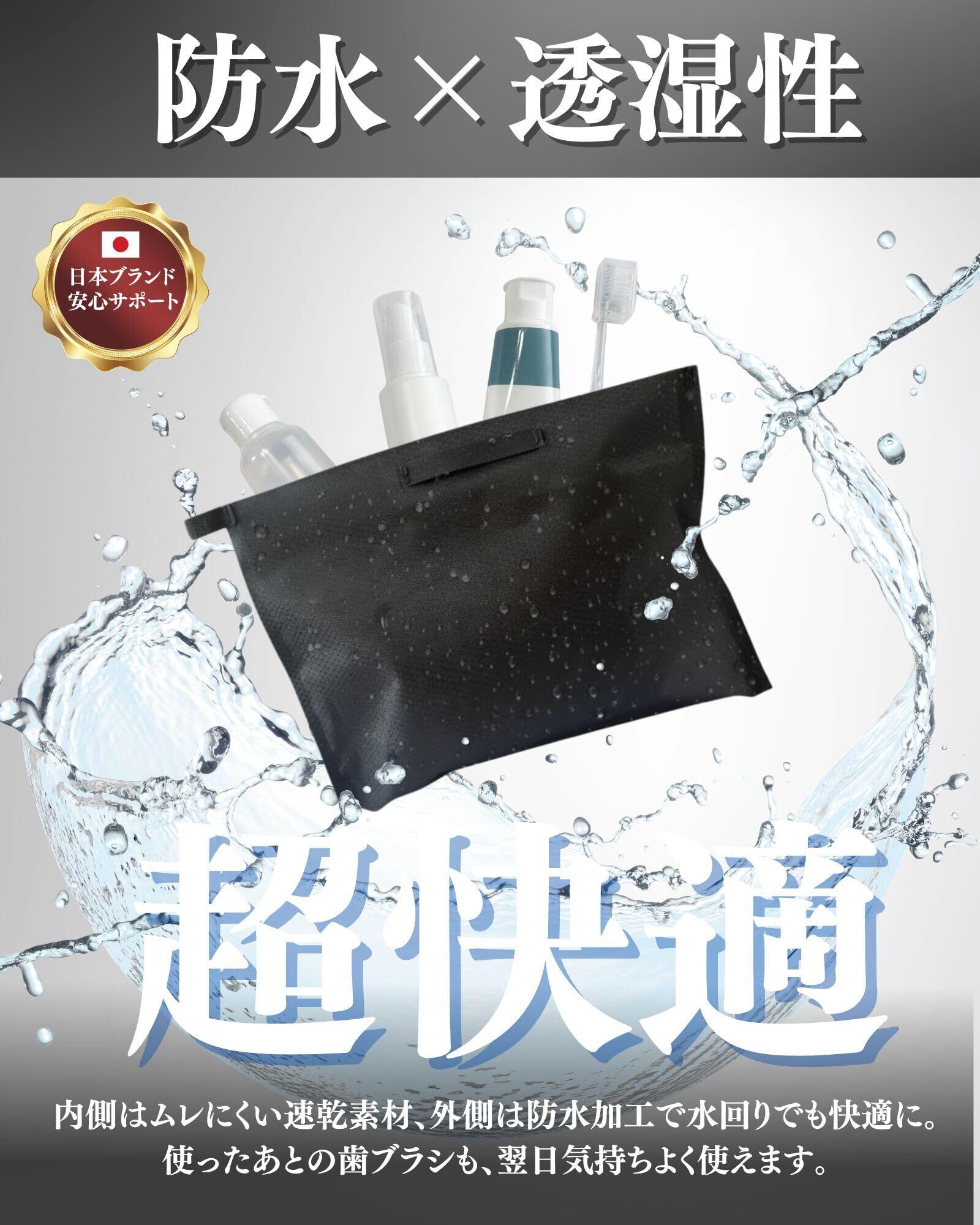 【濡れたまま収納OK】使った後の歯ブラシやタオルもそのまま入れられる、防水仕様のトイレタリーバッグ。ムレを防ぐ速乾素材で、いつでも清潔。