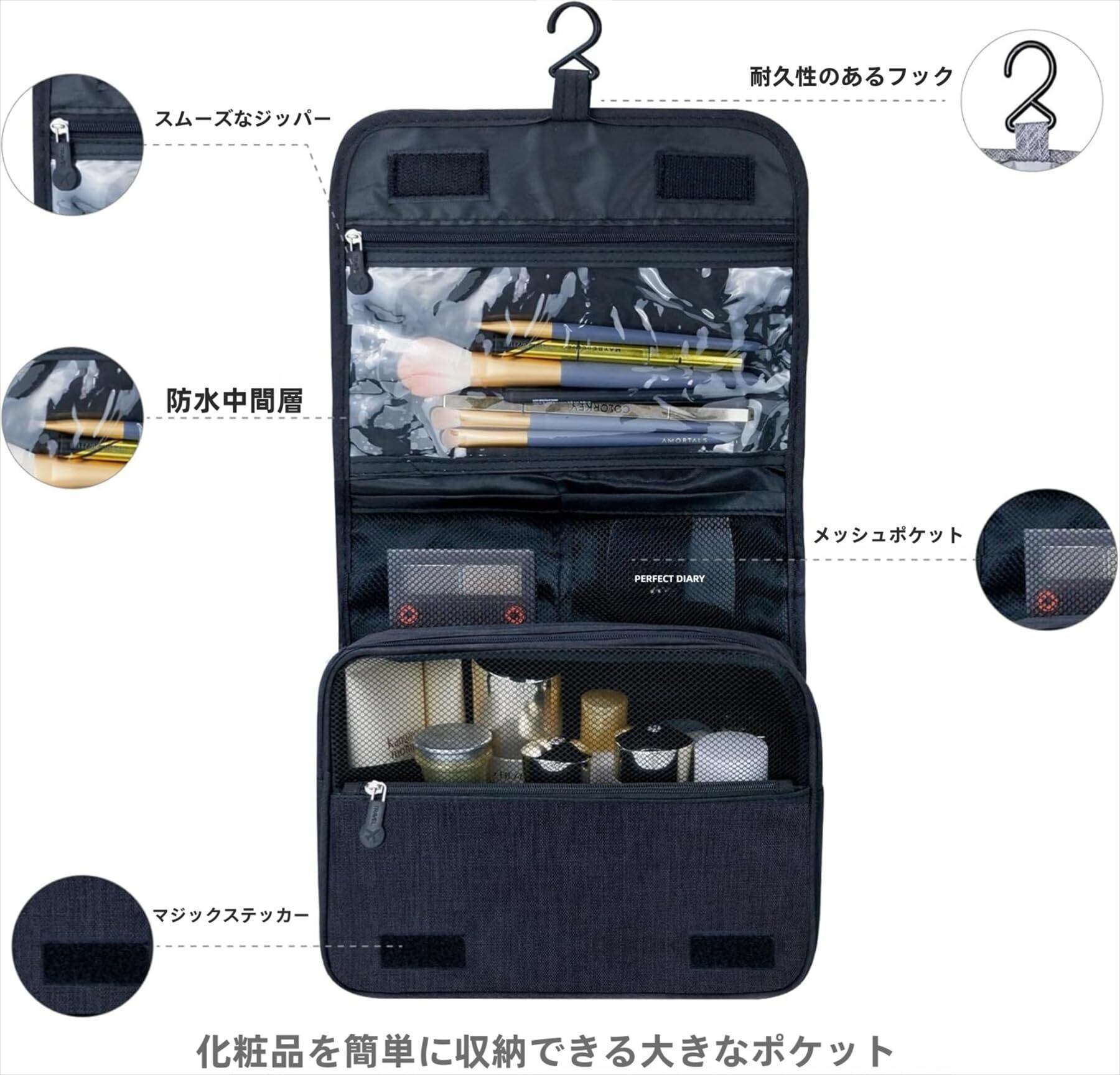【大容量収納&便利な仕切り】: 複数のポケットとメイン収納スペースを備え、化粧品、歯ブラシ、シャンプーボトル、ドライヤー、小物まで整理可能。ゴムバンド付きでボトルを立てて収納でき、液漏れ防止に役立ちます。
