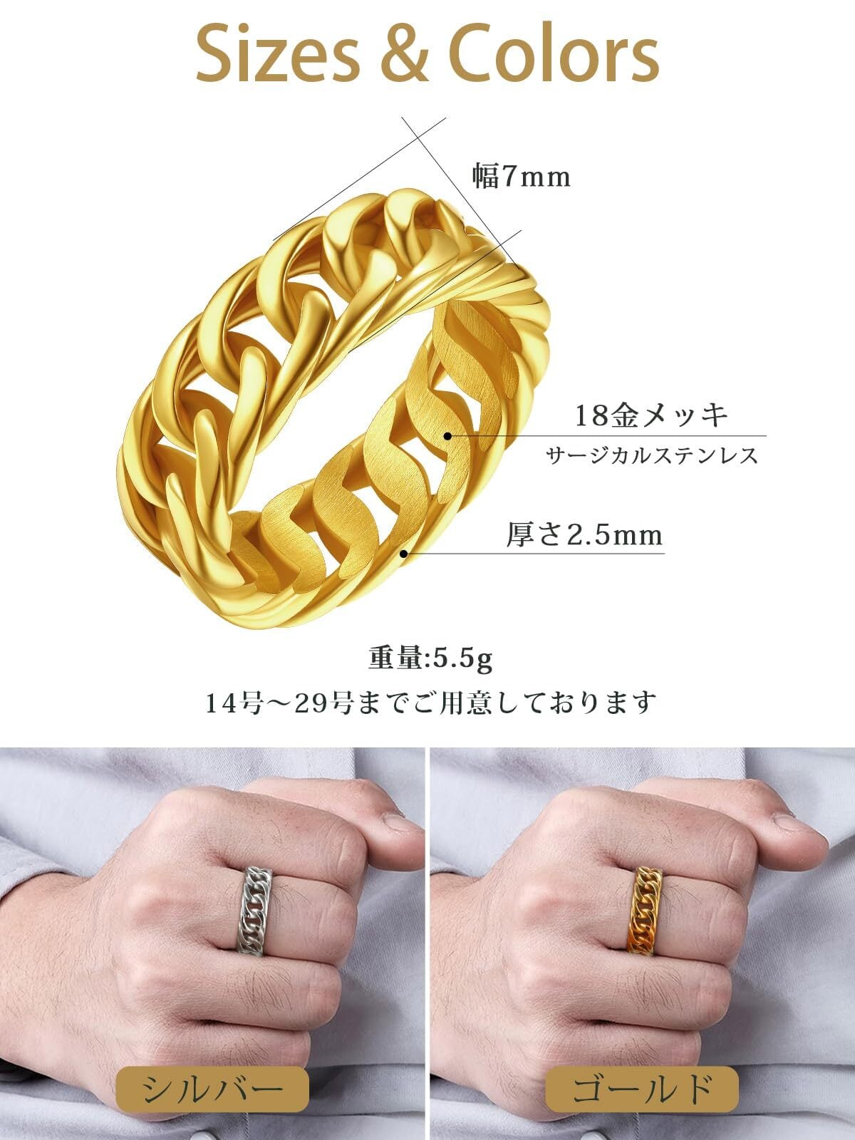 [FindChic] 喜平リング メンズ ゴールド指輪 サージカルステンレス アレルギー対応 太め 幅7mm 18金めっき シンプル ファッションリング 男女兼用 プレゼント アクセサリー シルバー 14号
