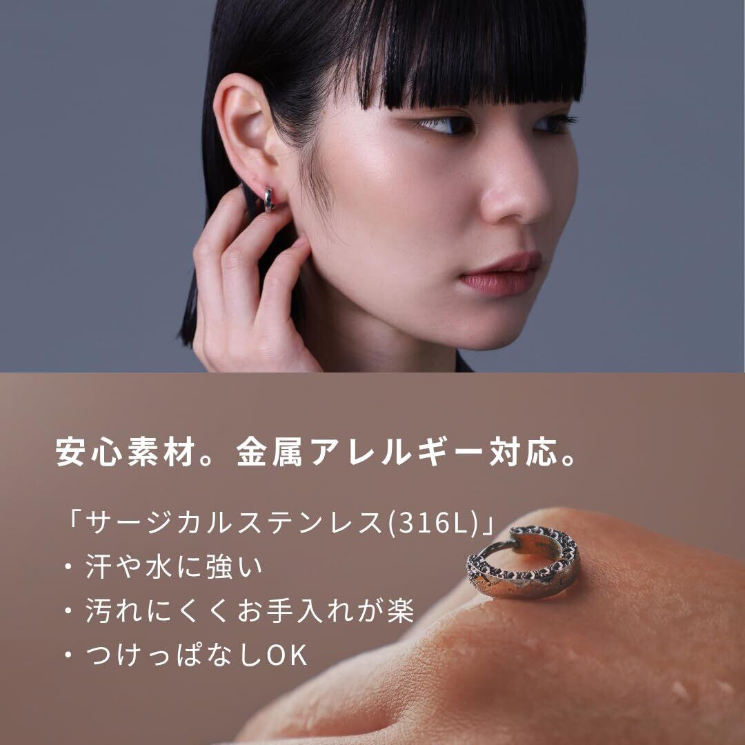 【金属アレルギー対応】サージカルステンレス(316L)。 金属アレルギー対応。金属アレルギーの方でも使用していただけるので、自分用だけでなくプレゼントとしても安心してお選びいただけます。水や汗にも強く錆びにくく、変色もしにくいのでお手入れの手間もほとんどかかりません。 海や温泉などのシーンでもつけっぱなしOKのタフな素材です。 非常に硬い金属なのでピアスポストが曲がりにくく、外れにくいのも特徴です。