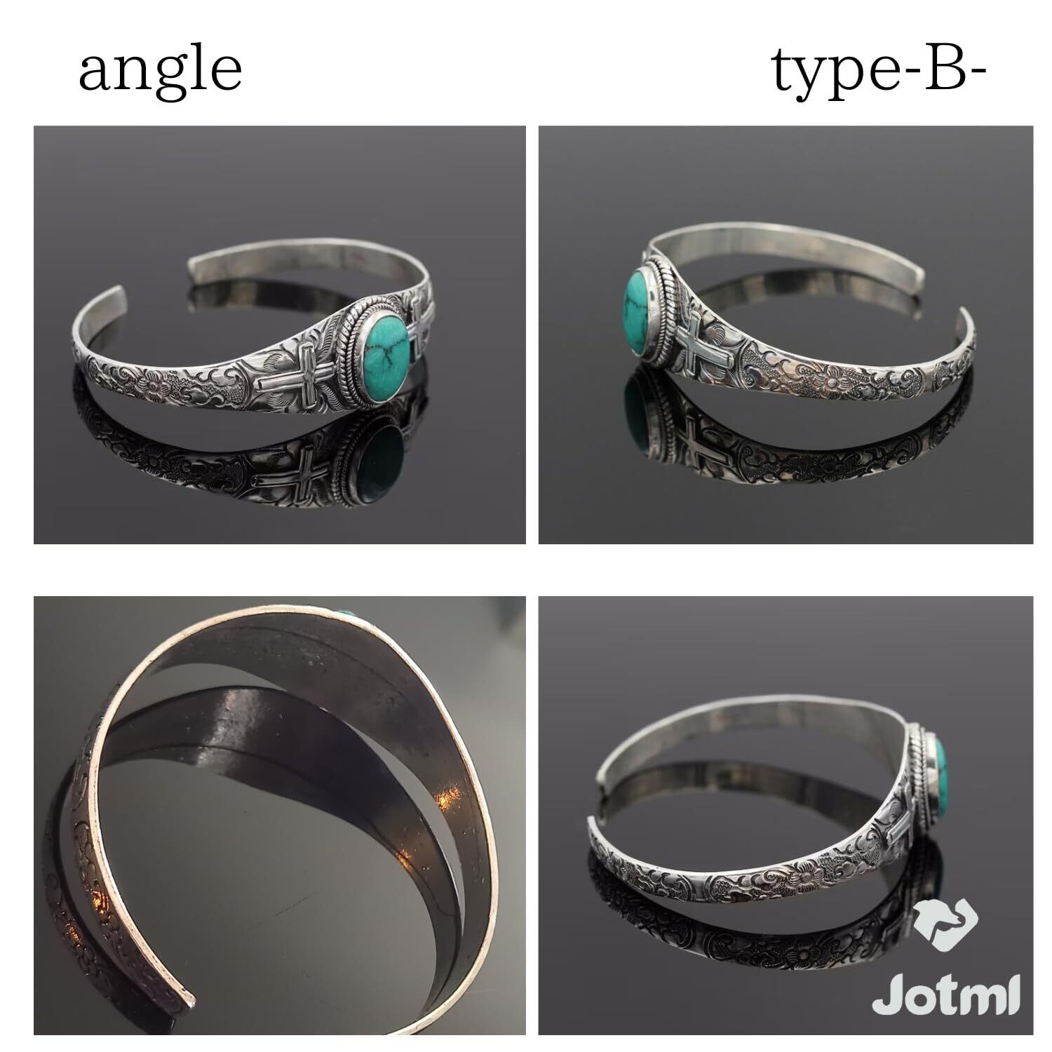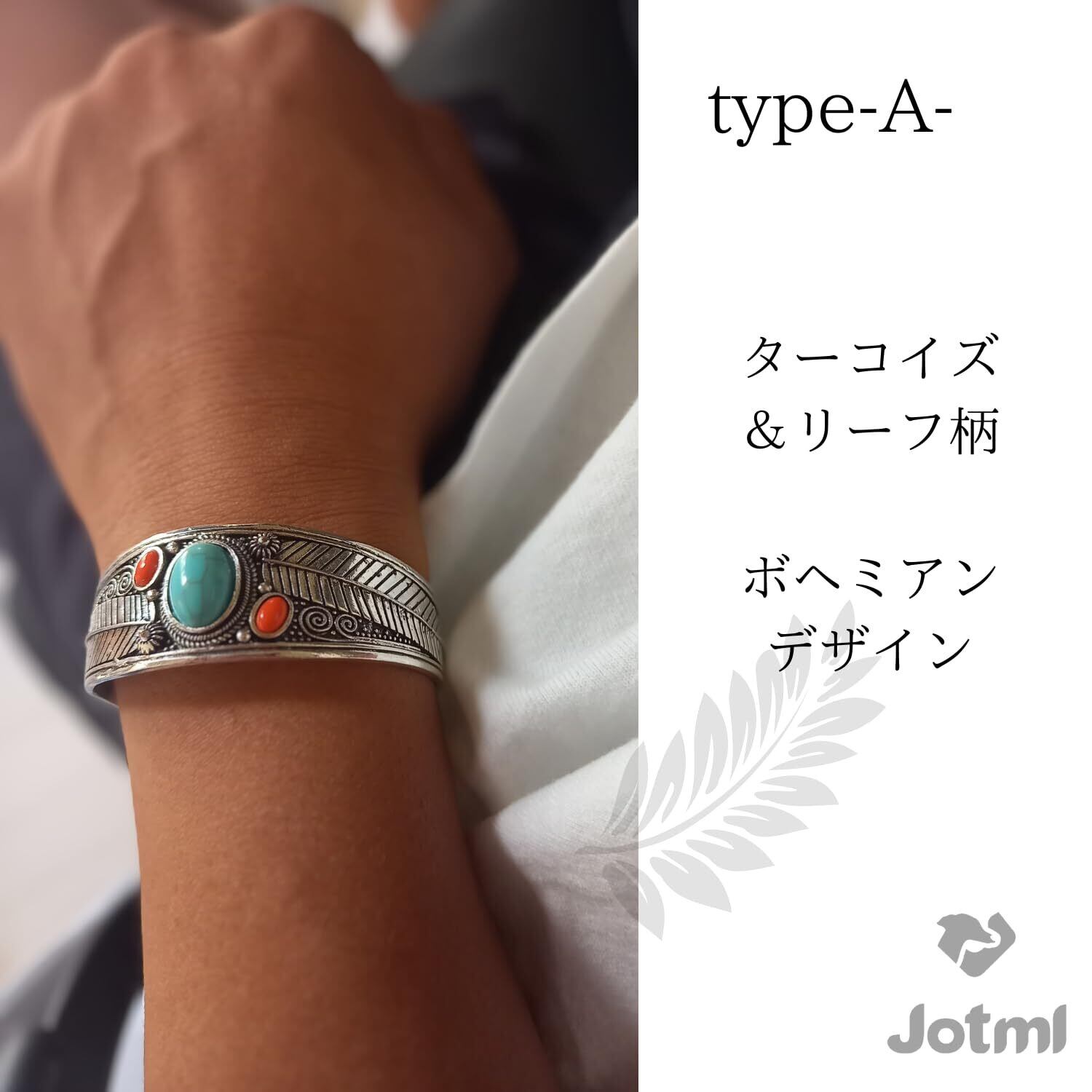 【デザイン】typeA:ターコイズとリーフ柄のボヘミアンデザインが、腕もとに色気とアクセントを足してくれます!これ一つだけで存在感があり、シンプルでラフな服装にもぴったりです。typeB:ターコイズとクロスのボヘミアンデザイン。