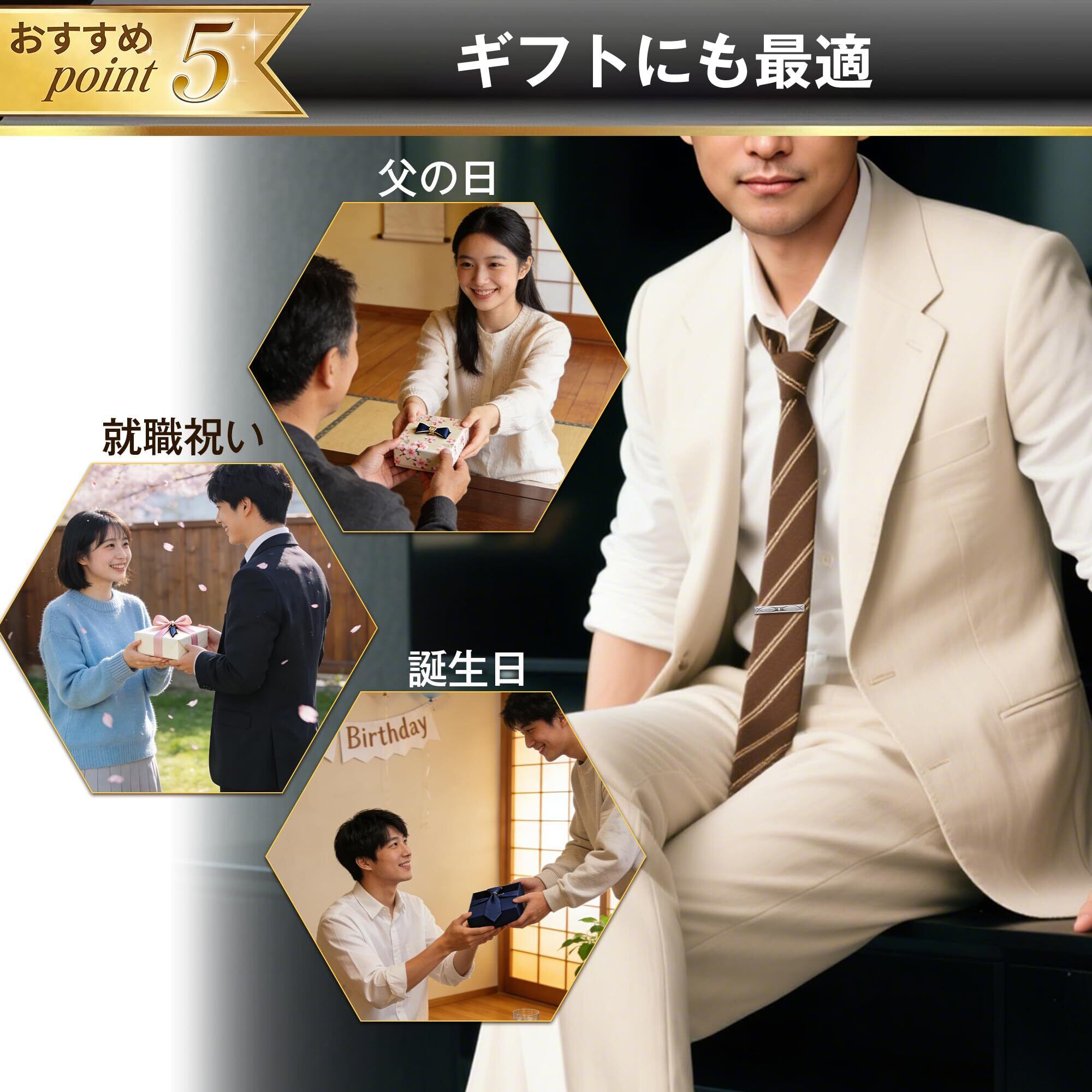 ③【ズレにくく安心設計】 しっかり挟める強力クリップ。 ネクタイが動きにくく、1日中スマートな印象をキープ。
