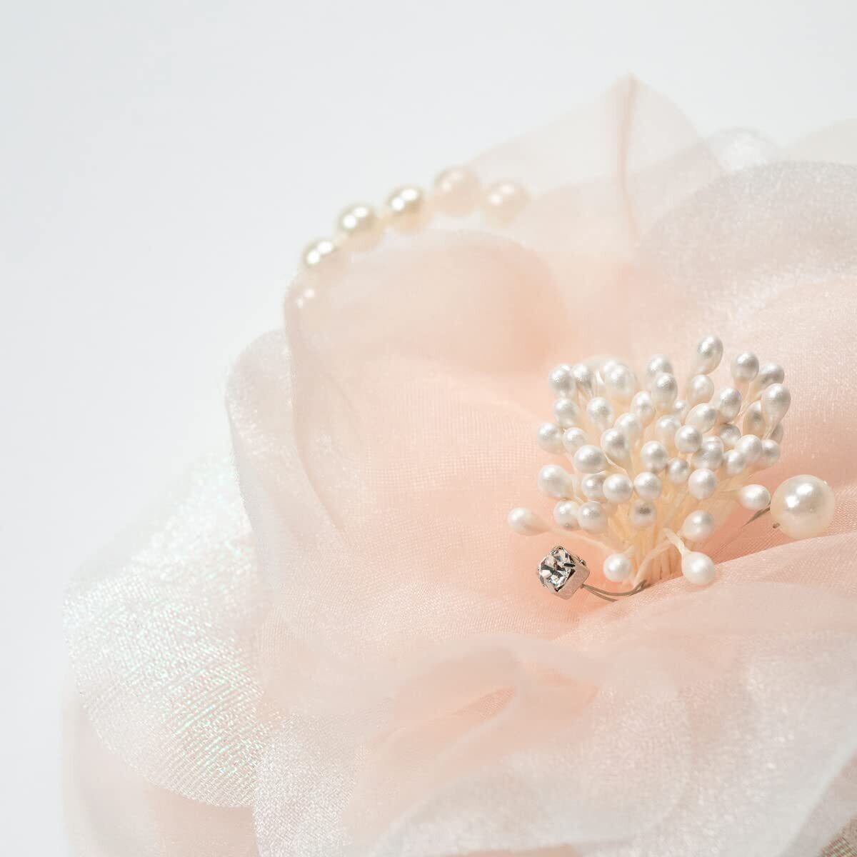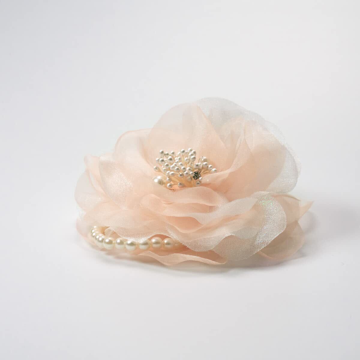 シフォンとオーガンジーを幾重にも合わせふんわりとボリュームのあるコサージュです。お花の中心のパールと1粒のラインストーンがアクセント。サイドにあしらったパールが胸元にきらり。エレガントな装いにもぴったりです