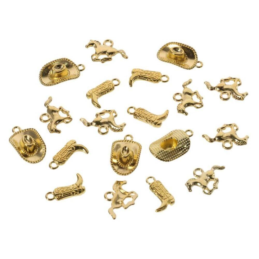 1.パッケージに含まれるもの: カウボーイハット、カウボーイブーツ、ランニングホーススタイルを含む3つのスタイルの60個のゴールデンウエスタンカウボーイチャーム、各スタイルの20個を受け取ります。さまざまなニーズを満たすのに十分な量とさまざまなスタイル