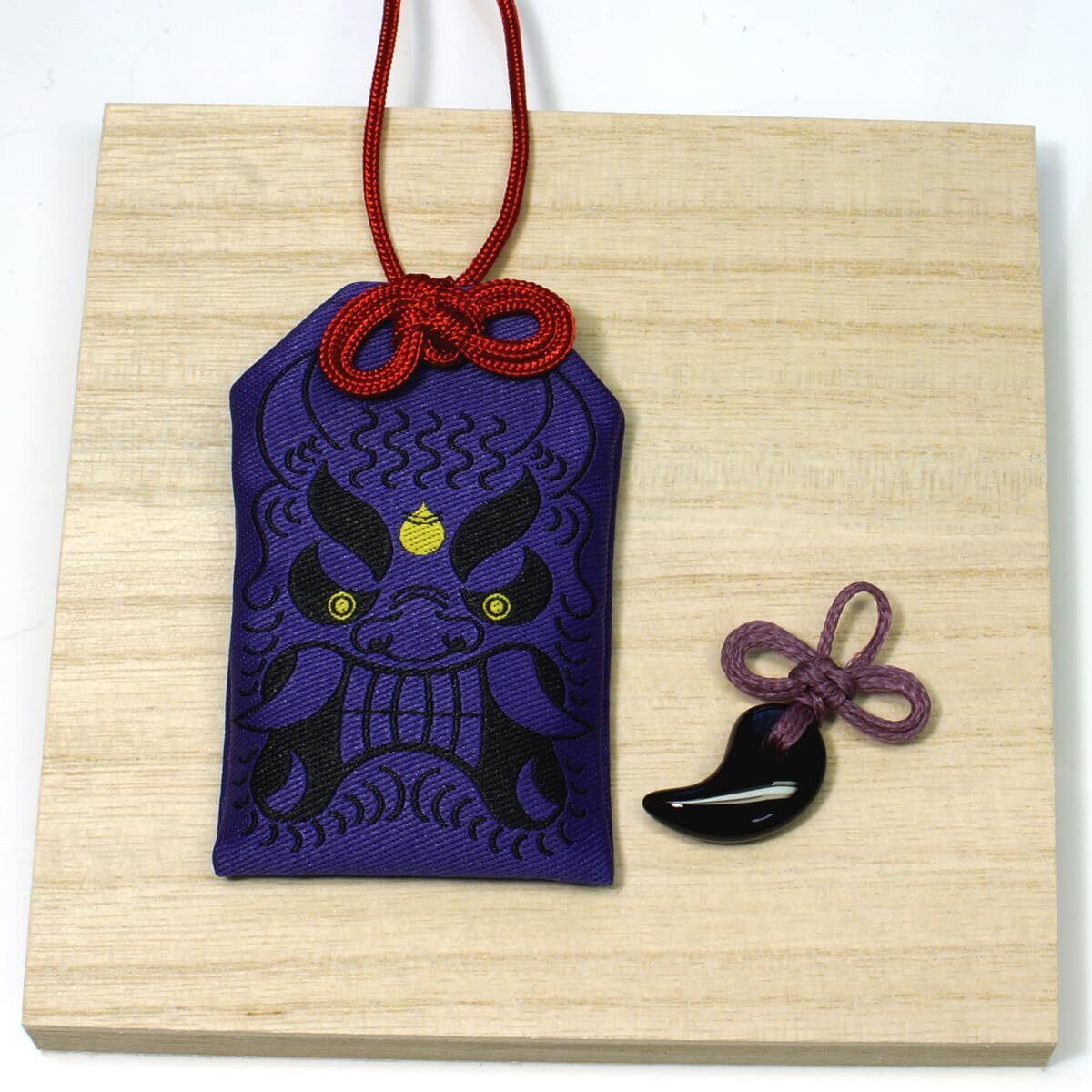 勾玉の御守チャームが鬼(アオオニ)のデザイン御守袋の中に入っています。
