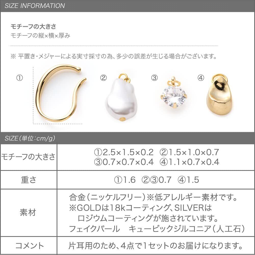 美ラインのイヤーカフと、大粒ビジュー・バロック風パール・凹みドロップメタルのチャームがセットになった片耳用イヤーカフ。コーデに合わせて4wayで楽しめます。同シリーズとの着せ替えを楽しむのもあり◎